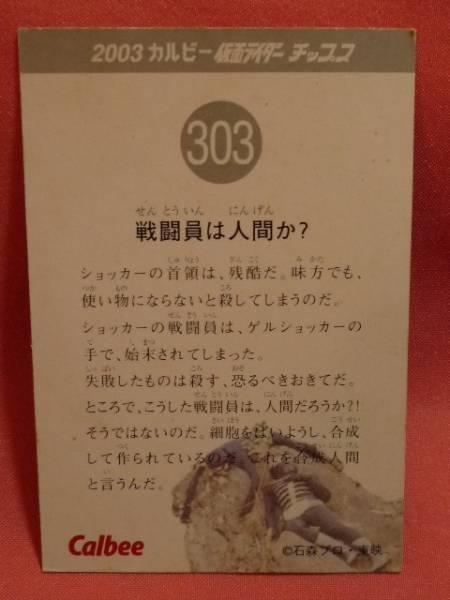☆商品説明☆ ご覧いただきありがとうございます^^ 2003年カルビー 仮面ライダーチップスの303番『戦闘員は人間か?』のカードです。と~ってもカッコイイですよ^^大きさはタテ 約8.5cm、ヨコ 約5.8cmです。たいへん古いものですがコレクション用として大切に保管していましたのでたいへんきれいな状態ですが家庭で保管していた物になりますのでご理解いただける方のご入札をお願い致します。 ☆発送方法☆ 定形外郵便、ゆうぱっく ☆コメント☆ ノークレーム、ノーリターンでお願いします。ご不明な点がございましたらお気軽にお問合わせ下さい。他にも仮面ライダーキャラクターグッズたくさん出品しております☆ 良かったらご覧下さいね*^^*