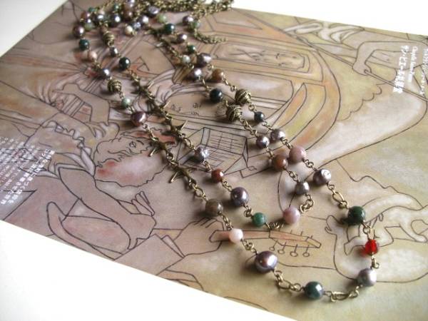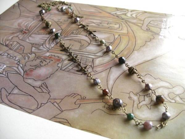 ロゼッタの宝石箱・・シリーズです♪ベネチアの記憶・・シックなインディアンアゲートのネックレス2点セットです♪同じデザインの長さ違いです♪シックな色合いのインディアンアゲートにグレーパープルの淡水パールやデザインチャームや小鳥さんのチェーンを合わせてノスタルジックな表情です♪♪インディアンアゲートは6ミリ、8ミリのランダムカット、淡水パールはバロックやポテトです♪長い方のネックレスは110センチ位で調節自由です♪短い方のネックレスは全長85センチ位で調節自由です♪それぞれ単品やブレスレットやピアスも出品しています♪♪シンプルで飽きのこないいつまでも着けられるデザインを考えて作りました!ハンドメイドをご理解頂いてノークレーム、ノーリターンでお願いします