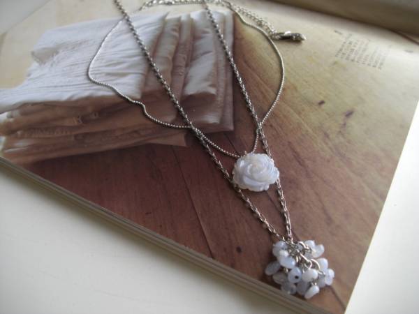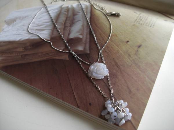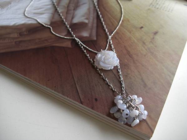 ロゼッタの宝石箱・・シリーズです♪アンニュイな水色・・繊細なブルーカルセドニーのネックレス2点セットです♪ミニタンブルや薔薇のブルーカルセドニーは淡い水色が可憐な表情です♪6ミリ位のミニタンブルのカルセドニーは小さなブーケのように集めてデザインチェーンを合わせました♪長さは73センチ+アジャスター12センチ位で最長85センチ位です♪20ミリ位の薔薇のカルセドニーには華奢なボールチェーンを合わせました♪長さは45センチ+アジャスター10センチで最長55センチ位です♪それぞれ単品やブレスレットやピアスも出品しています♪シンプルで長く着けていただけるデザインを考えて作りました!ハンドメイドをご理解頂いてノークレーム、ノーリターンでお願いします