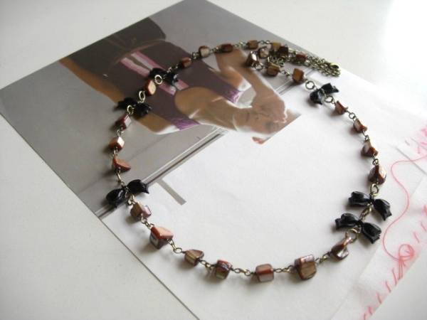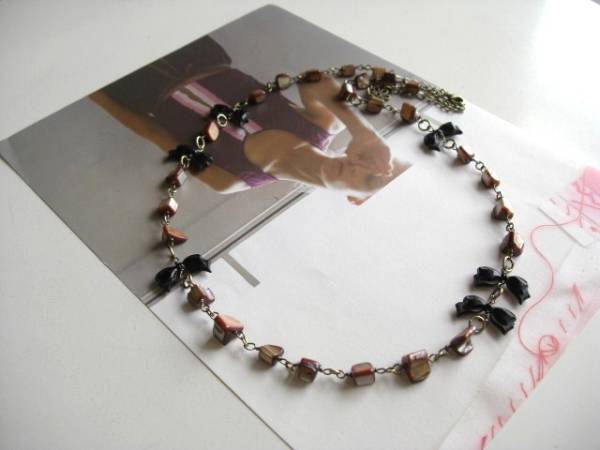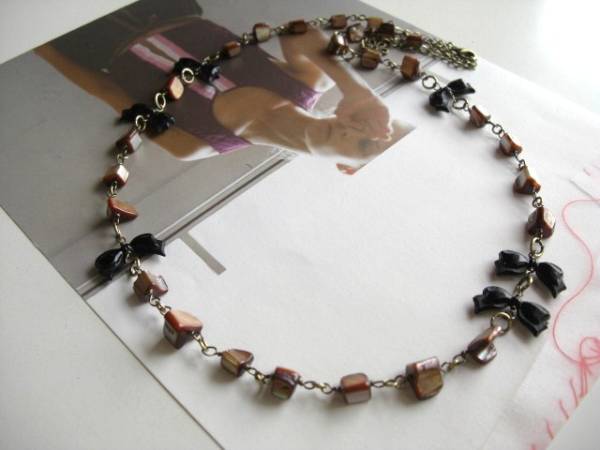 儚さを重ねて・・シリーズです♪リボン・マニア・・シックなダークパープルのシェルビーズのネックレスです♪黒のリボンのドイツビーズを合わせてロマンチックな表情です♪シェルビーズは8ミリ位のスクエア、リボンモチーフは20×8ミリ位です♪長さは70センチ位で調節自由です♪お揃いのブレスレットも出品しています♪シンプルで長く着けていただけるデザインを考えて作りました♪♪ハンドメイドをご理解頂いてノークレーム、ノーリターンでお願いします。