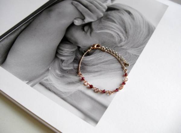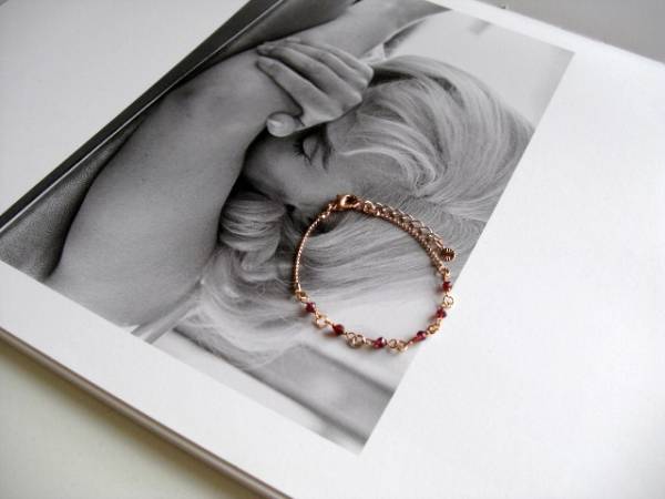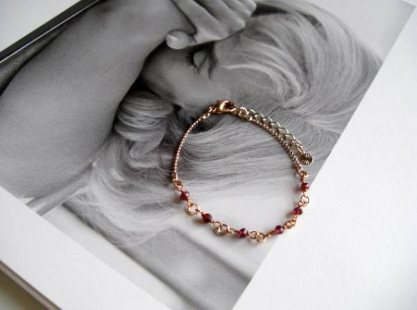 小粋にセレクト・・シリーズです♪モンローに憧れて・・深い赤のガーネットのブレスレットです♪宝石質のラウンドカットのガーネットにピンクゴールドのボールチェーンを合わせてひっそり華やかな表情です♪3ミリ位のラウンドカットのガーネットは秘めた赤が印象的です♪長さは16センチ+アジャスター6センチで最長22センチ位です♪お揃いのネックレスやピアスも出品しています♪♪シンプルで飽きのこないいつまでも着けられるデザインを考えて作りました!ハンドメイドをご理解頂いてノークレーム、ノーリターンでお願いします