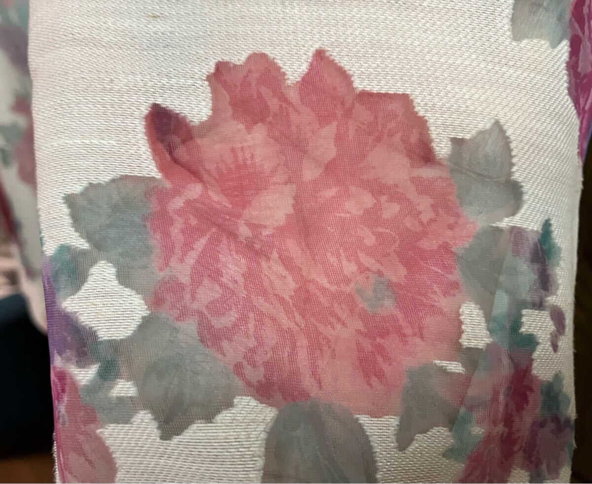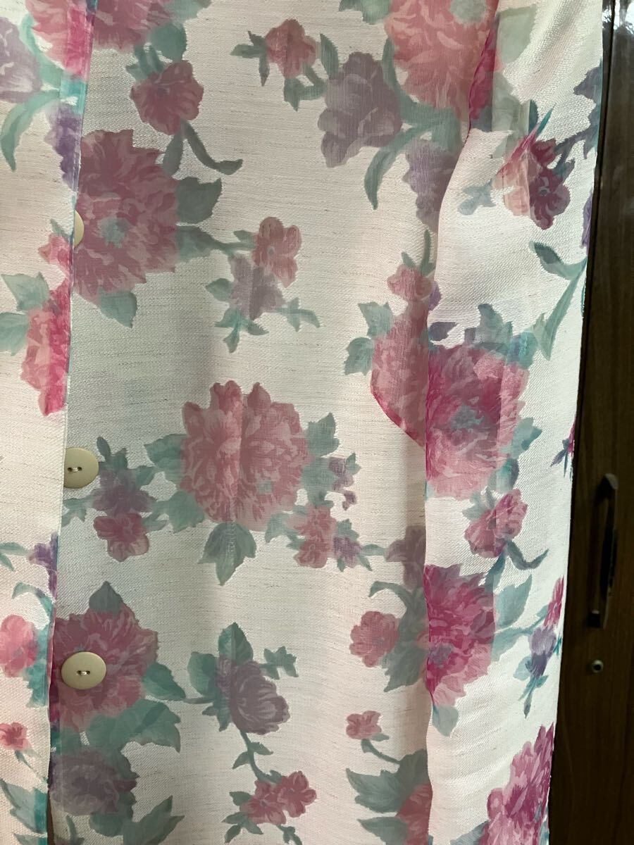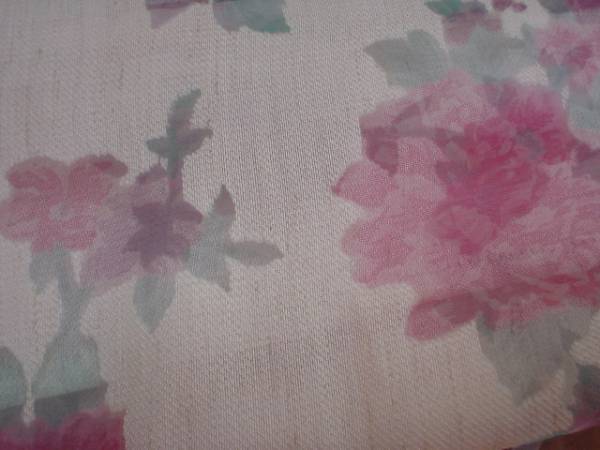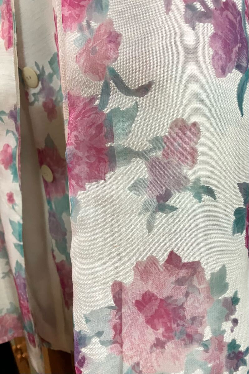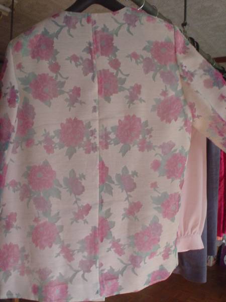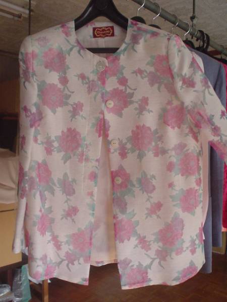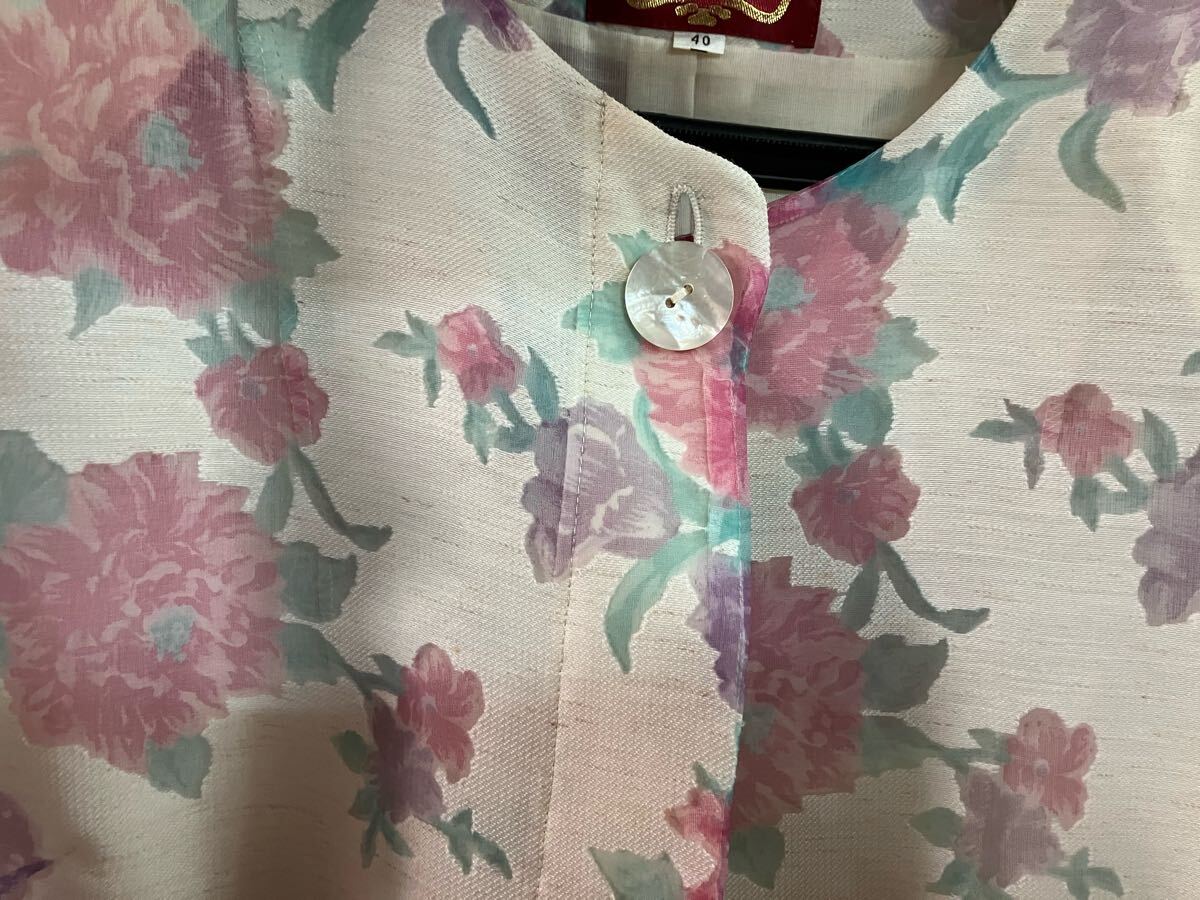 バラの柄のジャケット サイズ40 (USED)生地: 表地;ポリエステル47%、レーヨン46%、麻7%(裏地あり)裏地;キュプラ100%袖のところのバラの柄のところは透けてます、特にお袖のところは裏地がないので、6番目と7番目で撮りましたが、バラの花のところがちょうど透けてオシャレな感じです。