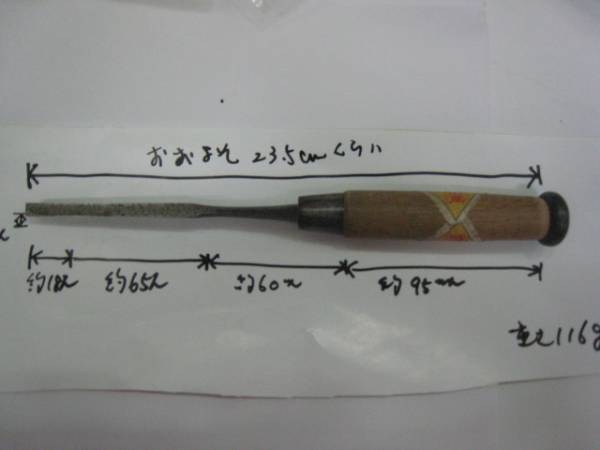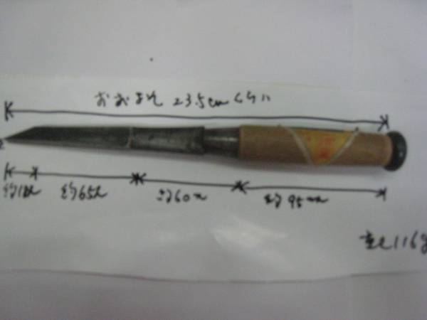昔ながらの金物屋です。(https://kanamonosakaiya.web.fc2.com/) 越彦の鑿を昔仕入れたものがあるので出品しました。 仕入れたまま何十年も寝ているので色もくすみ錆びがもあります。 かつらが取れていたので、私どもで付けたのですが、 それでも良いと言って下さるお方にお願いします。 |