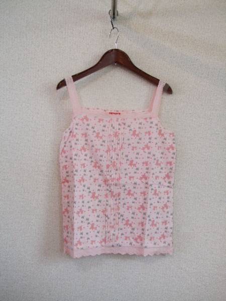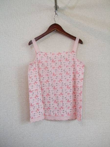 商品紹介 | プードルとリボン、ハートのプリントがかわいいノースリーブです。 前襟と肩紐、裾はレースになっています。 薄めのピンク地にプリント部分は濃いピンクとグリーン、ベージュが使われています。 《素材》 綿100% |