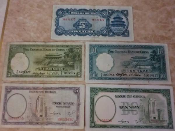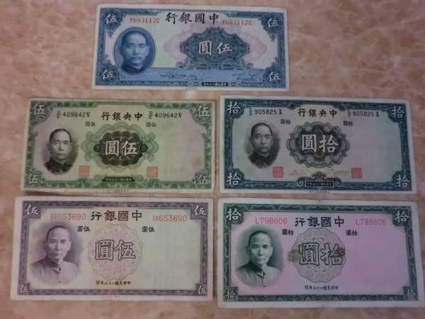 中国銀行・中央銀行 伍圓・拾圓の5種5枚セットです。