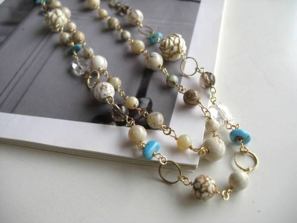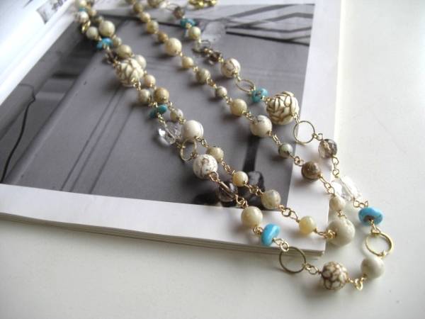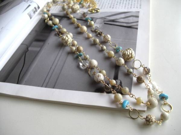 ニューヨーク・テイスト・・シリーズです♪白い薔薇・・個性的な石を集めたネックレス2点セットです♪アフリカンオパールやターコイズ、スモーキークォーツやクラックルストーンやドイツ樹脂薔薇を合わせてロマンチックな表情です♪アフリカンオパールのネックレスは6ミリ、8ミリ、10ミリの丸玉を紡ぎました。長さは102センチ位で調節自由です♪2連にされてもブレスにされても素敵です♪ターコイズのさざれやスモーキークォーツの10ミリのオーバルや6ミリ、8ミリのラウンドカット、水晶のスクエアカット、アフリカンオパールの丸玉、ドイツの樹脂薔薇は16ミリ位です♪淡い色でまとめてやさしい表情です♪長さは全長102センチ位で調節自由です♪2連にされても素敵です♪それぞれ単品やお揃いのブレスレットも出品しています♪♪シンプルで長く着けていただけるデザインを考えて作りました♪ハンドメイドをご理解頂いてノークレーム、ノーリターンでお願いします