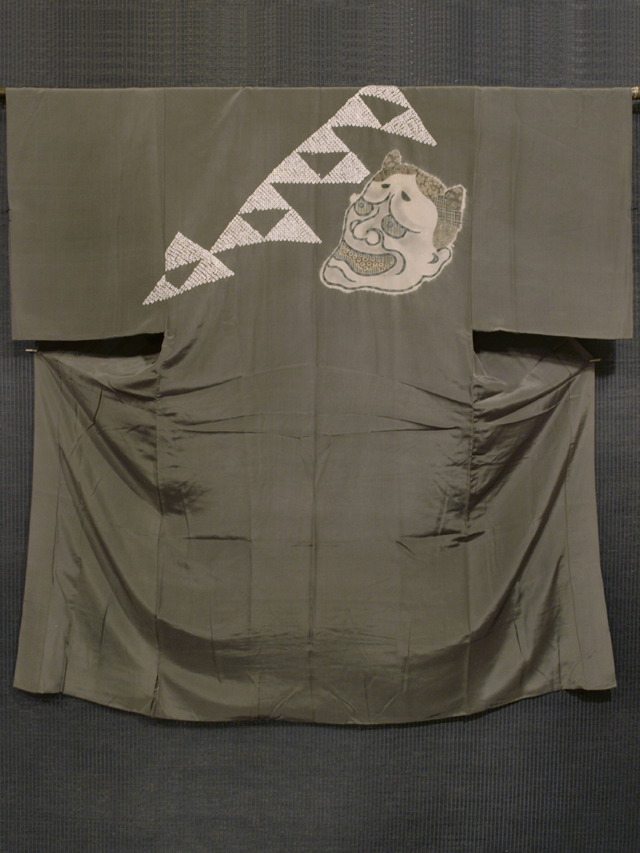| 詳細 | 深く沈んだ麹塵(きくじん)色の地に絞り染めで鹿子でかたどられた三つ鱗(うろこ)とさまざまな小紋が配された般若の文様が染められている縮緬の男性用長襦袢です。袷仕立てです。あくまで目安ですが、適合身長は 162~164cm 前後です。 大正~昭和初期ごろにつくられたと思われるアンティークのお品です。般若のなかに五三桐、渦、たて縞、七宝、格子縞などの小紋が手描きで寄せられていて、おもしろみとこだわりが強く感じられる意匠です。鱗文様は縁起の良い吉祥文様です。手ざわりのやわらかでなめらかな、シボのごくこまかな精華縮緬地です。 胴裏が全体的に黄変気味で、胴裏の腰付近に直径約 15cm の黄変が 4 か所あります。また左前袖に直径約 2~3mm の薄い黄変が 3~4 か所、左後袖に直径約 1mm のよごれが 1 か所、左後身ごろの膝上に直径約 1cm のうすよごれが 1 か所ありますが、ほとんど気にはならなさそうです。そのほかに目につくしみやよごれなどのダメージも見あたらず、この時代のものとしては良好な状態です。 |