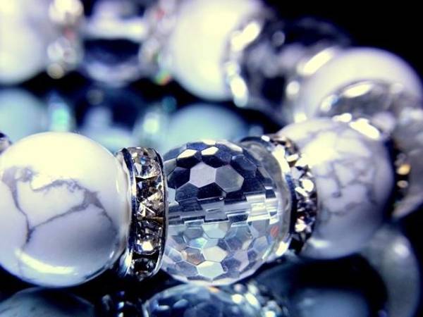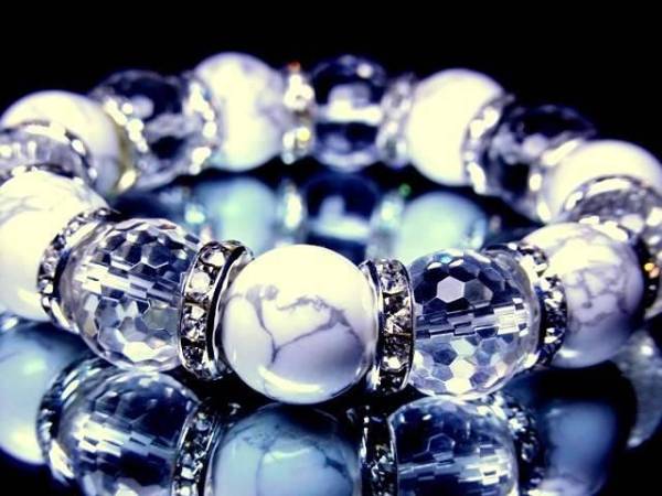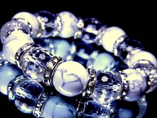 128面カット水晶とホワイトターコイズ14ミリの組合せ数珠です。