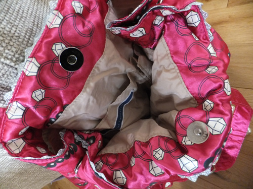 光沢感のある生地にジュエリー柄、取り外しできるパールのバックチャームが付いています。