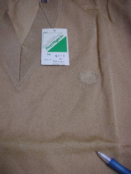 レトロ感溢れる超個性的タウンカジュアルニットVセーター薄地 シワのつかない生地で 今 トレンディな プロデューサー巻きに最適セーター。あのワンポイント付が流行った 胸にワンポイント付の入手困難物 レア品です。 1970年代産のエレガントな 透ける薄地パール編みVセーター生地は 微光沢ありのベージュ色です。シルエットは細身で少しタイトなデザイン。素材は着心地良い アイロン不要で伸縮素材のニット地。 素材は アセテート 85% ナイロン 15% の極細糸 微光沢クロスです。サイズ(実測平置採寸)は 肩幅 41,5cm(表示 L) 着丈 63,5cm 身幅(脇下) 53cm 身幅(胴回) 36~48cm 袖丈(上肩先より) 59cm 1970’年代ファッションの個性的なレア物 です。適応サイズ表示は  の表示です。 勿論 新品です。ただ 1970年代産もので 在庫ヨゴレ有りのジャンク品です。三番目画像で示す様に 前折目部分に日ヤケ有です。普段着 作業衣 サイケファッション 等の個性的ファッションに ご活用下さい。 また、ジャンク度レベルにより 少し価格差がありますけど 超安値の処分価格スタートとなります。よって お買い得となっております。くれぐれも ジャンク品である事をご了解のうえ ご入札下さい。そして どこか違う個性派ファッションをお楽しみ下さい。こちらは、こだわりの優れた縫製  First Flight ブランド テイト(社)日本製品です。