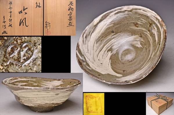 サイズは 155mmx高さ64mm です。 瀬戸市の無形文化財保持者 加藤錦三 氏 の 作品 です。動きある造型と うねりのきいた 刷毛目で 勢 いを感じる 逸品 です。書付もあります。写真を参考の上入札ください。宅配便80サイズにて発送します。他にも多数出品してます。同梱対応いたします。