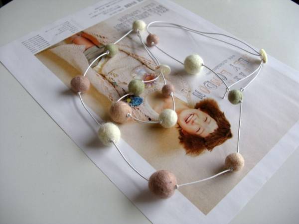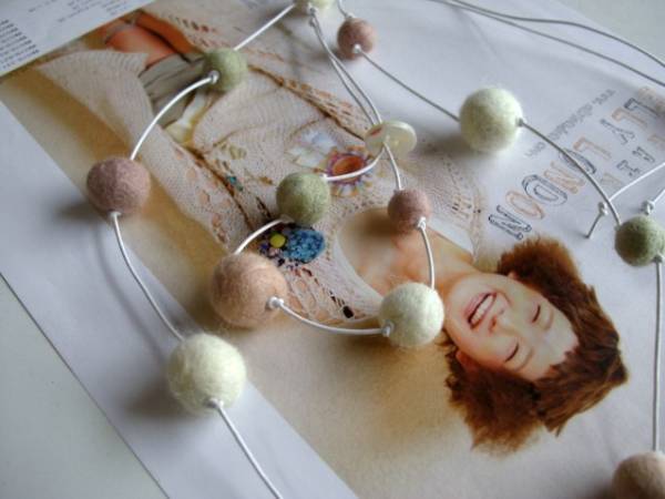 愛らしさの条件・・シリーズです♪フェルト玉マニアⅠ・・ふんわりやさしいフェルト玉のネックレス、ブレスレットの2点セットです♪ピンクやモスグリーン、ナチュラルホワイトなどやさしい色のフェルト玉を白のレザーコードに紡いでキュートな表情です♪フェルト玉は10ミリから20ミリ位までの大きさ違いです♪ネックレスは90センチ位で調節自由です♪ブレスレットは28センチ位で調節出来ます♪単品やピアスも出品しています♪ハンドメイドをご理解いただいてノークレーム、ノーリターンでお願いします♪