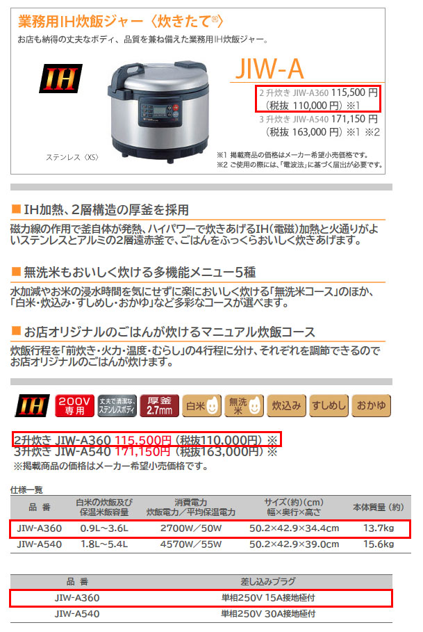 タイガー魔法瓶 業務用IH炊飯ジャー 炊きたて JIW-A360 を出品いたします。 ■特徴■ お店も納得の丈夫なボディ、 品質を兼ね備えた業務用IH炊飯ジャー IH加熱、2層構造の厚釜を採用 磁力線の作用で釜自体が発熱、 ハイパワーで炊きあげるIH(電磁)加熱と 火通りがよいステンレスとアルミの2層遠赤釜で、 ごはんをふっくらおいしく炊きあげます。 無洗米もおいしく炊ける多機能メニュー5種 水加減やお米の浸水時間を気にせずに 楽においしく炊ける「無洗米コース」のほか、 「白米・炊込み・すしめし・おかゆ」など 多彩なコースが選べます。 お店オリジナルのごはんが炊ける マニュアル炊飯コース 炊飯行程を「前炊き・火力・温度・むらし」の4行程に分け、 それぞれを調節できるので お店オリジナルのごはんが炊けます。 パナソニック SR-PGB36P同等品です。 ■仕様■