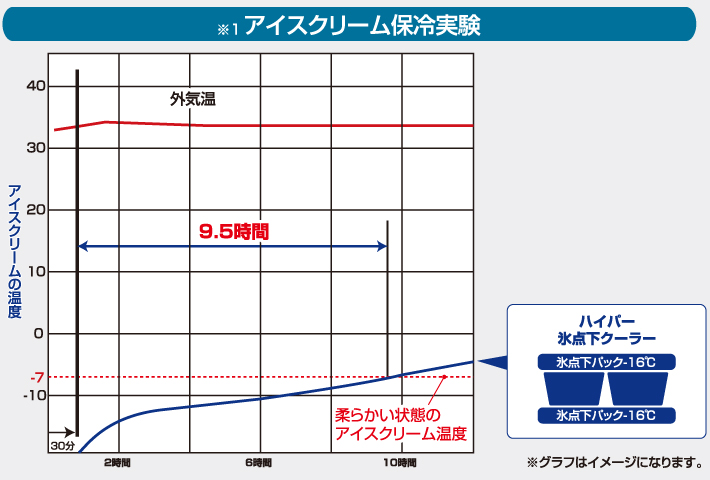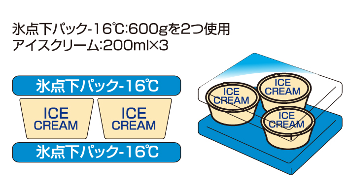 氷点下パック使用でアイスクリームが約9.5時間保存可能!