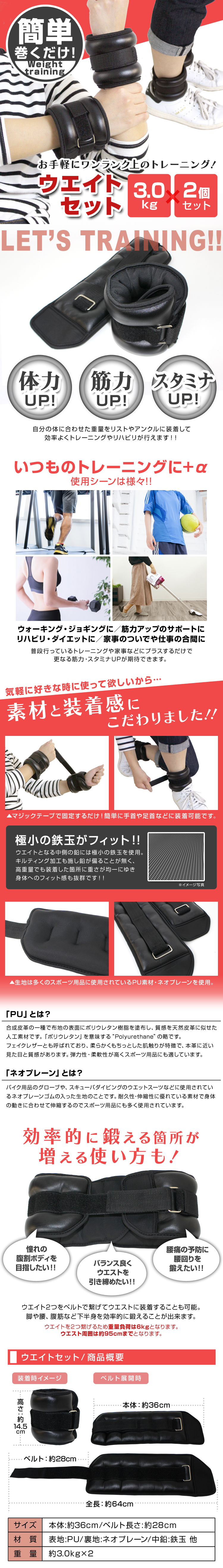 幅広く使用することができるリスト&アンクルウエイトです。 普段の生活の中で使用する事で自然にトレーニングすることができ、 トレーニング時に使用する事で筋力アップのサポートになります。 トレーニング以外にもダイエットやリハビリにも最適です。 装着はマジックテープで固定するだけなので、とっても簡単です。 素材には伸縮性・耐久性に優れたネオプレーン(ゴム)を採用しています。 【商品詳細】 内容:リスト&アンクルウエイト 3.0kg ×2 カラー:ブラック 本体サイズ:(約)36cm×14.5cm ベルトサイズ:(約)28cm 重量:(約)3.0kg ×2 素材:PU、ネオプレーン、鉄玉 他 注意事項:・重量の表記は目安となります。若干の誤差が出る場合がありますのでご了承ください。 ・商品は、モニターによって色合いが異なって見える場合があります。 ・仕様・デザインは改良のため予告なく変更することがあります。 |