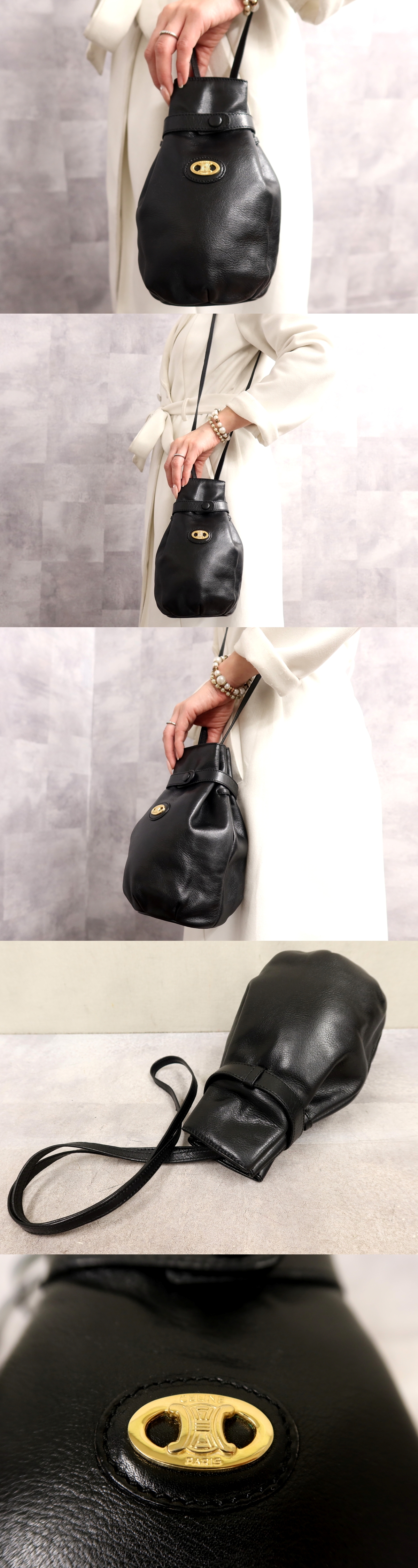 ●超美品●CELINE セリーヌ●カーフ レザー 本革●巾着 ショルダー バッグ●黒●ゴールド金具●肩掛け●収納 かばん●Js65393