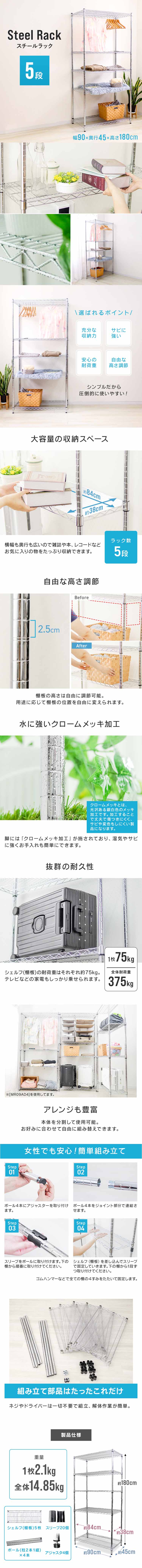WEIMALL スチールラック 5段 幅90×奥行45×高さ180cm 耐荷重375kg どんなお部屋・作業場にも合わせやすいシンプルなスチールラックです。 クギやネジを使わずに簡単に組み立て出来ます! 棚の高さを自由に変えることができます。 一人暮らしのお部屋やリビング、キッチン、物置など場所を問わず活躍できます。 アパレルショップの店頭用やオフィスにも使用されています。 |