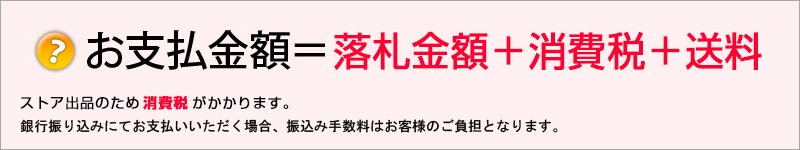 | 例) 落札金額が10万円の場合、 1回目の決済=10万円+消費税 2回目の決済=10万円+消費税+送料 合計20万+消費税+送料が決済され、その決済後、1回目の10万円+消費税がキャンセルとなります。 2回目の決済で与信枠を超えてしまった場合は、1回目の落札金額のみの決済が採用されますので、 送料は銀行振込となります事を予めご了承ください。 2回目の決済で与信枠を超える心配があるお客様、または、はじめから送料は銀行振込をご希望されるお客様は、 カートの「ストアへのご要望」欄に「送料は銀行振込希望」とご記入ください。 |