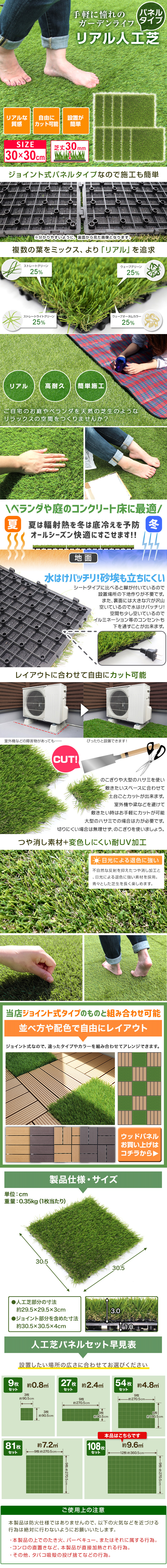 ジョイント式で簡単設置! 複数の葉をミックスしているからリアルな質感! 水はけもバッチリでお手入れも簡単! 屋外用の照明やイルミネーションなどの配線を裏面の隙間に通すことも可能です。 園芸用のハサミでカットできるので自由に配置も可能です。 大切なお庭やバルコニーのアレンジにぜひお役立てください♪ ■ 商 品 詳 細 内容 人工芝パネル ×108枚 サイズ 人工芝部分の寸法:(約)幅29.5cm×長さ29.5cm×高さ3cm ジョイント部分を含めた寸法:(約)幅30.5cm×長さ30.5cm×高さ4cm 重量 1枚あたり:(約)0.35kg 適用箇所 屋外(テラス、バルコニー、庭等) 保証期間 7日間 ※商品到着後7日以内の初期不良・破損のみご対応させていただきます。 注意事項 ・海外製品のため多少の傷、汚れがある場合がございますがご了承ください。 ・商品は、モニターによって色合いが異なって見える場合があります。 ・仕様・デザインは改良のため予告なく変更することがあります。 商品コード:ACE005SA |