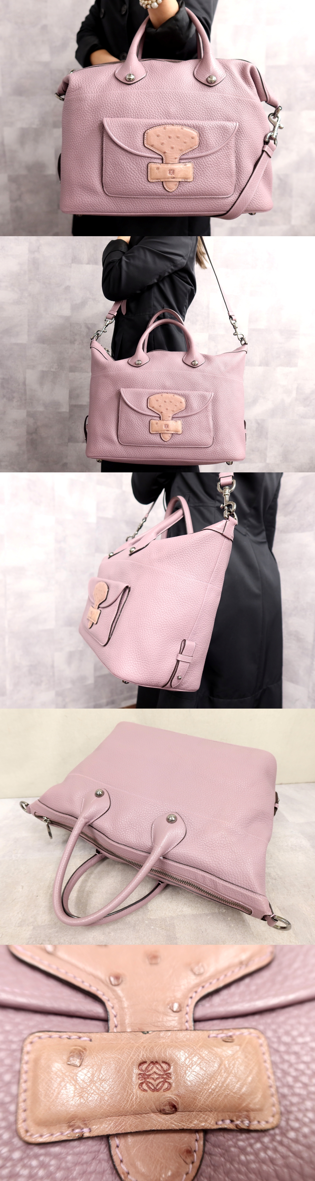 ●超美品●ロエベ●アナグラム●ロゴ型押し●オーストリッチ 本 ダチョウ 革 カーフ レザー●2way ハンド バッグ●ライラック●A4●Js65608