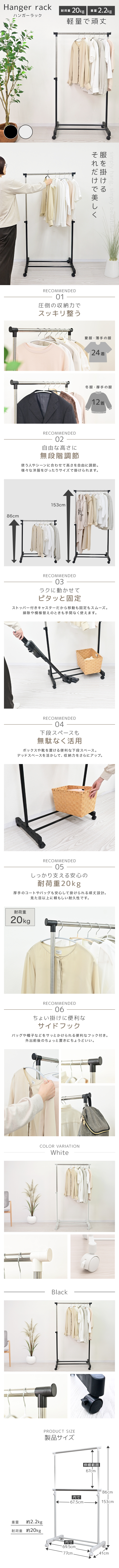 場所を選ばないシンプルなデザイン。 工具不要!女性一人でも簡単に組み立てられます。 最大24着まで、洋服がスッキリ片付く抜群の収納力! 耐荷重20kgなので、重たいコートや冬物をかけても頑丈! キャスター付きでたくさん掛けても移動がラクラク♪ お掃除や模様替えなどの移動に便利です。 86cmから153cmまで高さ調節も自由自在! ロングコートを掛けたり、下部には収納ボックスなどを置くことができます。 ロータイプに調節すれば、子供用のハンガーラックや押入れ収納としても使えます。 花粉の季節や梅雨時期など、室内干しにも使えて便利! 【商品詳細】 内容:ブラック サイズ:(約)幅77×奥行41×高さ86-153cm 重量:(約)2.2kg 最大耐荷重:(約)20kg 素材:PVC、スチール 【注意事項】 ・商品は、モニターによって色合いが異なって見える場合があります。 ・仕様・デザインは改良のため予告なく変更することがあります。 |