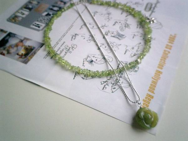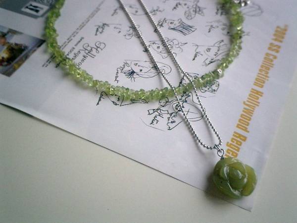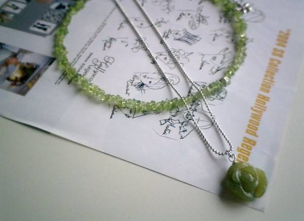 春色・セレクト・・シリーズです♪♪シックなダークグリーンのネックレス2点セットです♪神秘的なペリドットのネックレスと可憐なオリーブジェイドの薔薇のネックレスです♪単品でも重ねても色々な組み合わせで楽しんでいただけます♪3ミリから5ミリ位までのさざれのペリドットは間にジルコニアのロンデムを合わせました♪長さは45センチ+アジャスター12センチで最長57センチ位です♪オリーブジェイドの薔薇は1・7センチ位です♪華奢なボールチェーンを合わせました♪長さは70センチ+アジャスター12センチで最長82センチ位です♪それぞれ単品や長さ違いのネックレスやブレスレットも出品しています♪シンプルで飽きのこないいつまでも着けられるデザインを考えて作りました!ハンドメイドをご理解頂いてノークレーム、ノーリターンでお願いします