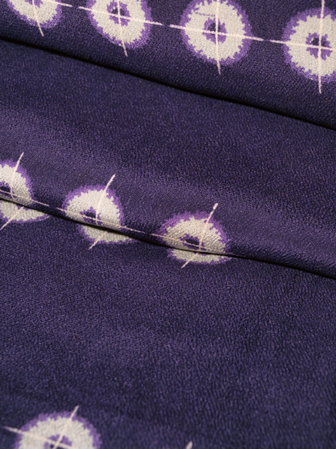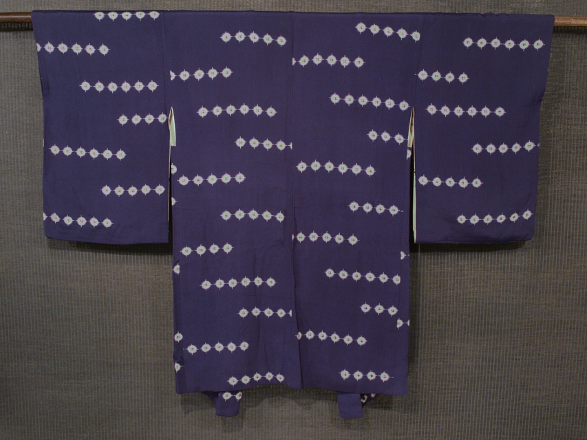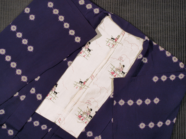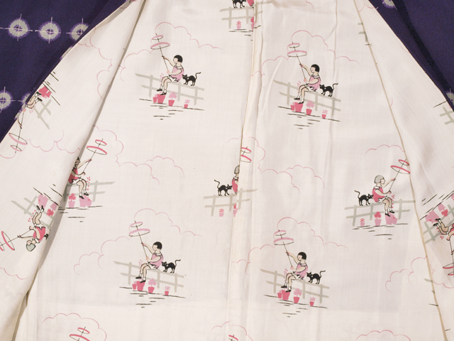 | 詳細 | 青紫色の地に抽象的な丸の文様が染められた縮緬の羽織です。袷仕立てです。 昭和初期ごろにつくられたと思われるアンティークのお品です。黒猫と少女が描かれた羽裏にとてもおもしろみがありますね。 左前袖のふりに直径約 5mm の小穴が 1 か所あります。羽裏が全体的に若干くすんでいますが、そのほかに目につく大きなしみやよごれ、褪色などのダメージは見あたらず、きれいな状態なので、小穴が気にならない方であれば、ご着用可能ですが、状態ランク=「D」のご着用対象外、リメイク素材用とさせていただきます。 |