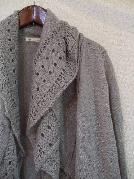商品紹介 | 透かし編みのショール風デザインがオシャレなカーディガンです。 前は開けて着る形です。 淡いグレーで他のアイテムと合わせやすいです。 素材:アクリル100% |
