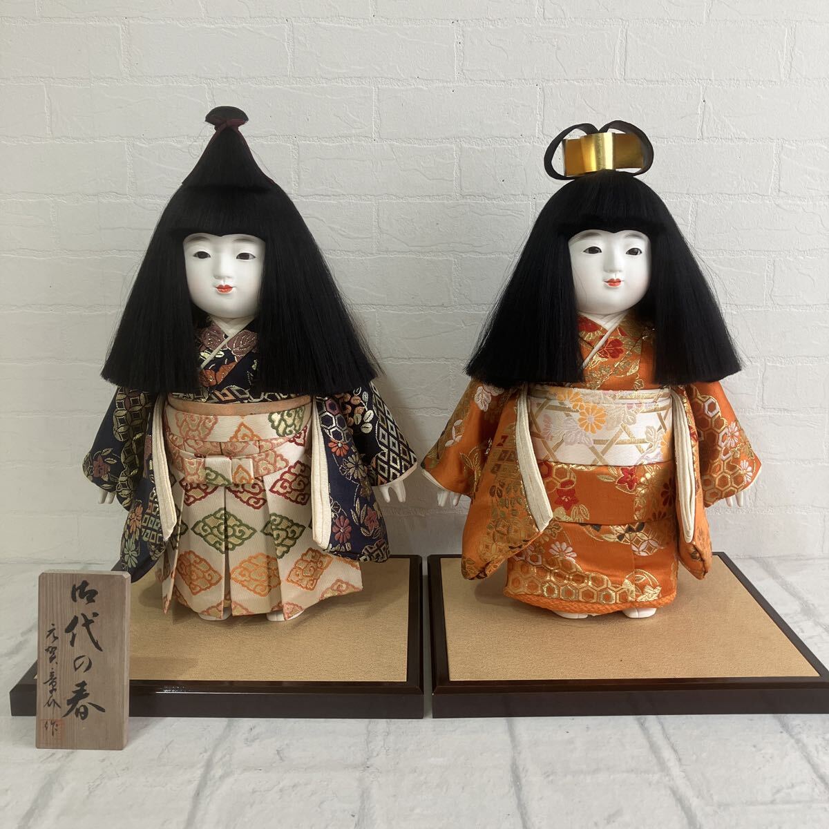 美品 3代目 元賀章介 市松人形 御代の春 みよのはる もとかしょうすけ 一対 台座 高さ約31cm 胡粉塗 西陣織 金襴 なにわの名工 日本人形