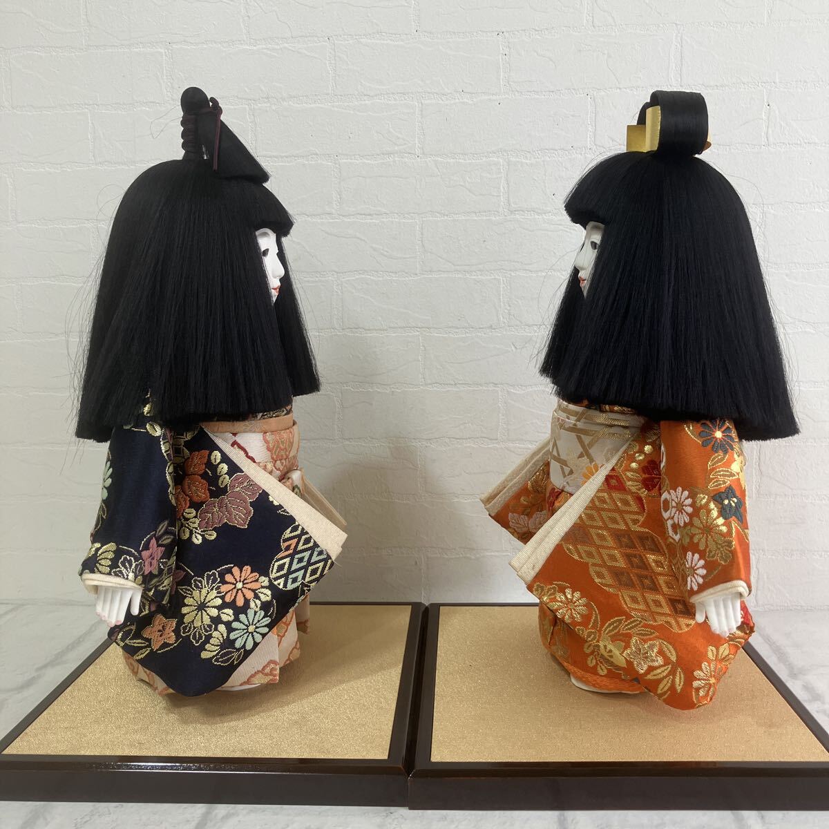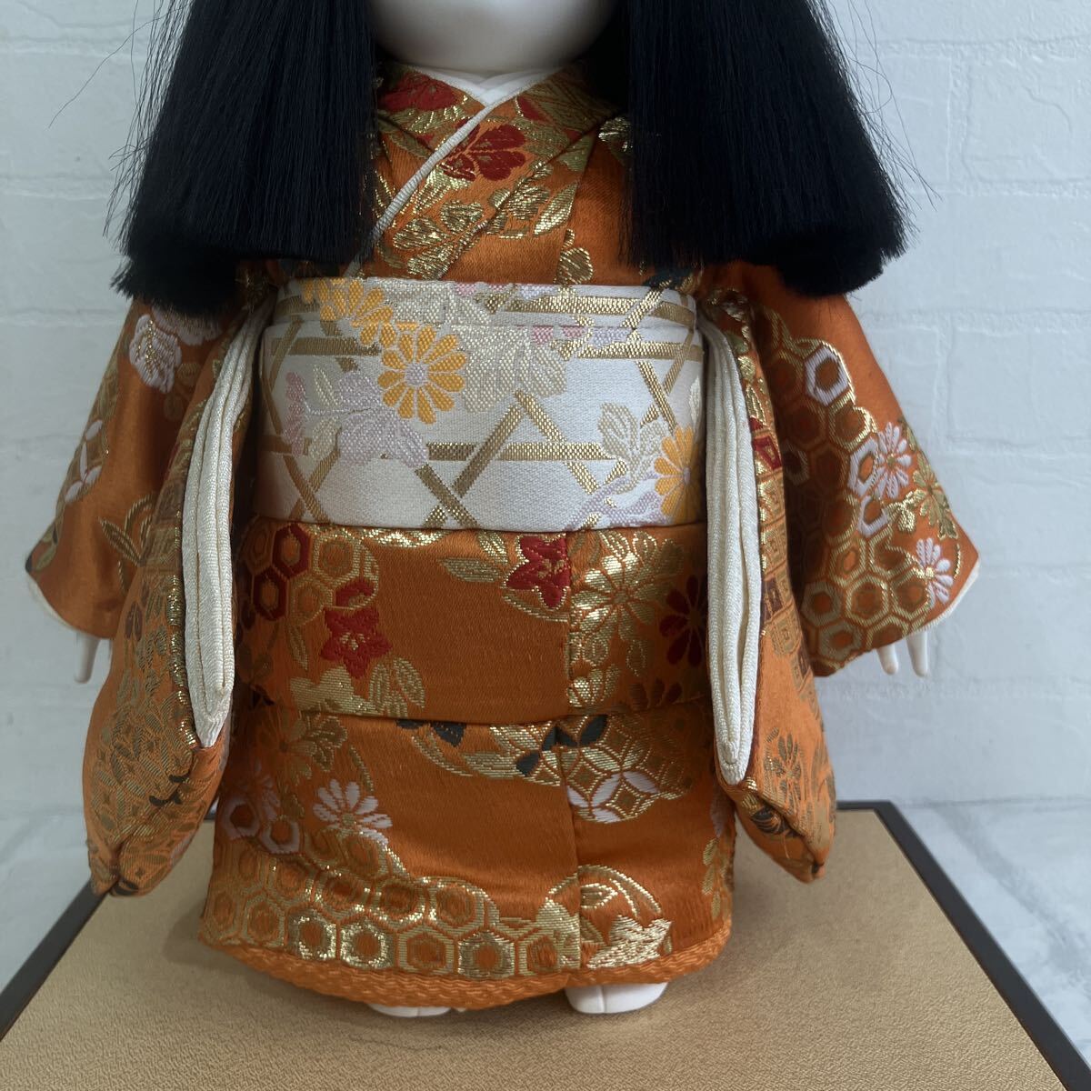頭(かしら)は胡粉塗り、衣裳は西陣織や金襴などの高級裂地を使用。