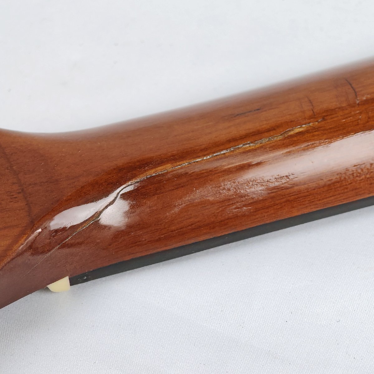 ネック折れを修復した痕があります。接着されているため演奏上は問題ないと思われます。