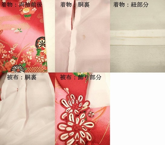 | 着物【化繊】の状態は接写画像のように 両袖前後・胴裏・紐部分に薄い汚れがございますが その他特に目立ったシミ汚れなどもなく大変良い状態です。 襦袢【化繊・単衣】の状態は特に目立ったシミ汚れなどもなく大変良い状態です。 長襦袢【化繊】の状態は接写画像のように 胴裏・飾り部分に薄い汚れがございますが その他特に目立ったシミ汚れなどもなく大変良い状態です。 お安く出品致しますので、是非この機会にいかがでしょうか? ※草履の表面・裏面に薄い汚れがございます。 ※髪飾りに薄い汚れがございます。