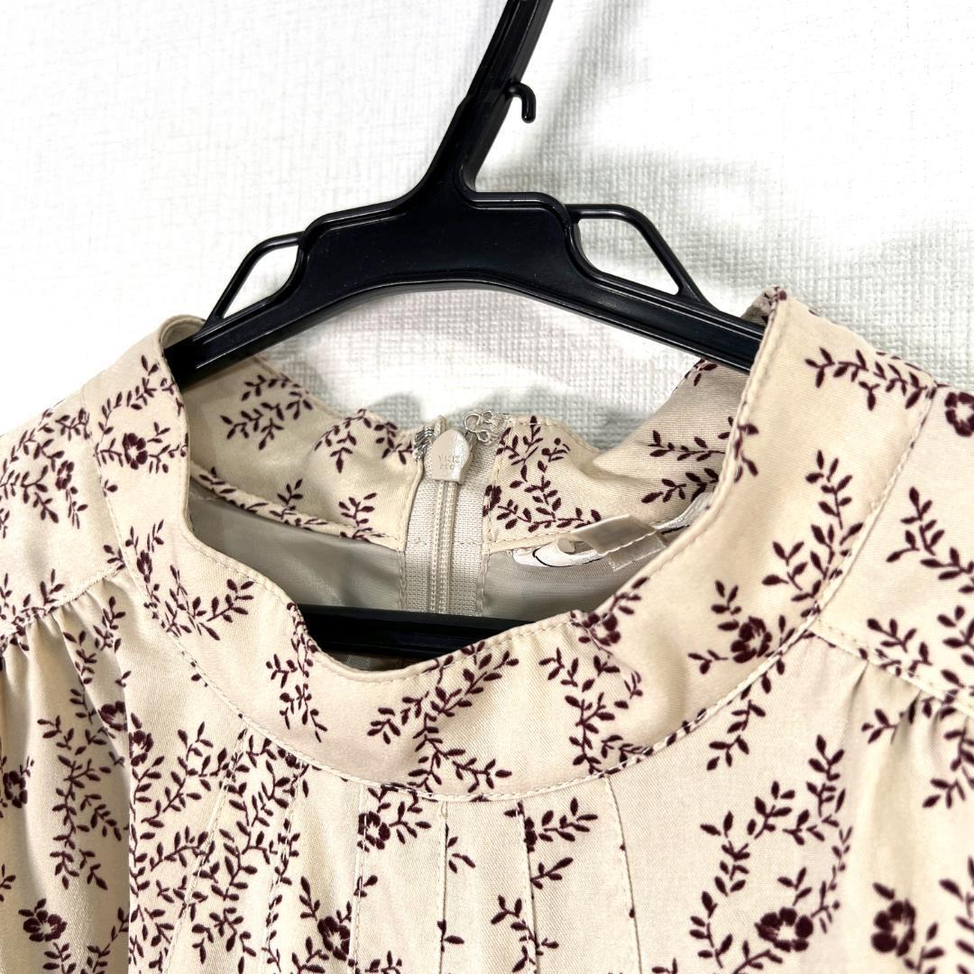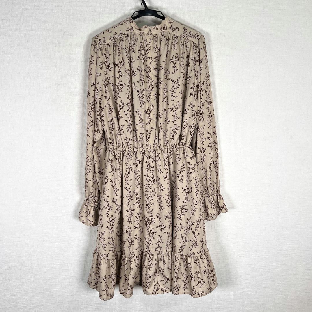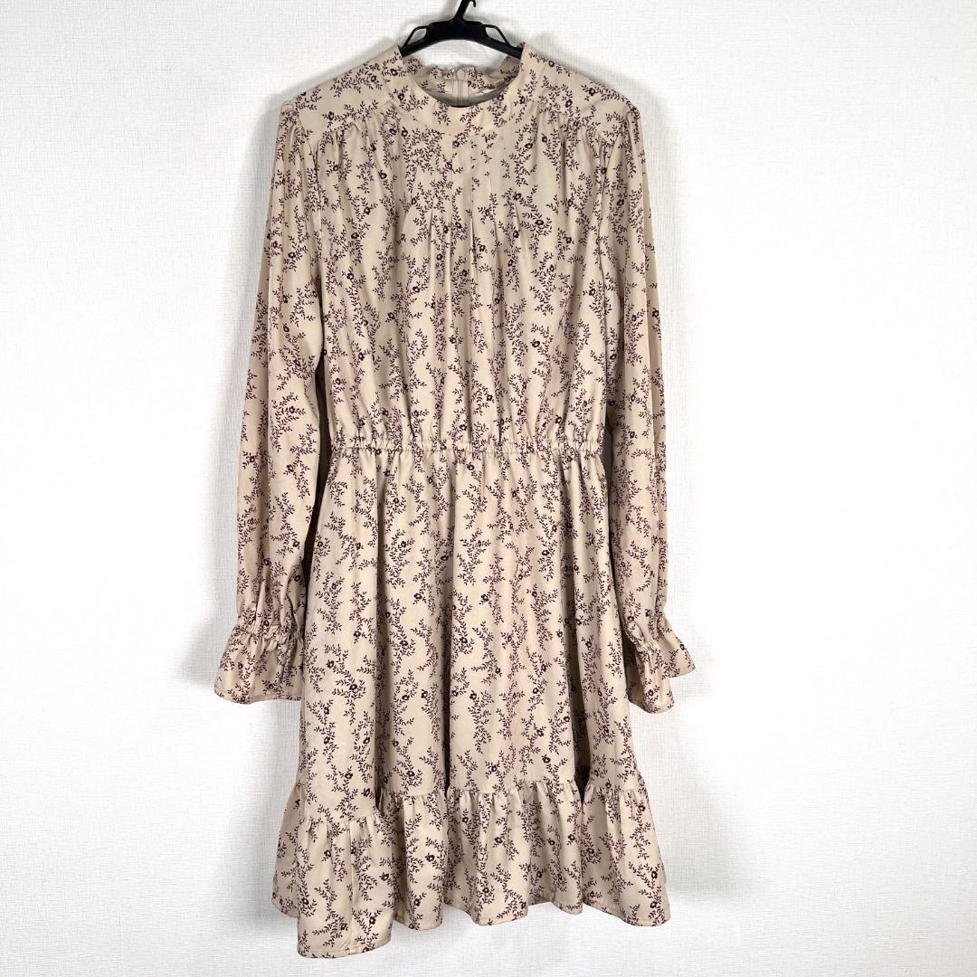 女性用のベージュ系のフラワープリント ひざ丈ワンピースです。