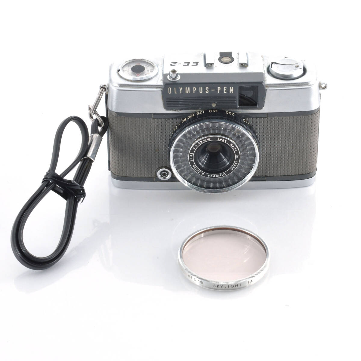OLYMPUS PEN EE-2は、自動露出を搭載したハーフサイズフィルムカメラで、気軽にフィルム写真を楽しめる1台です。36枚撮りフィルムで72枚撮影できる経済性と、コンパクトなボディが魅力。赤ベロも正常に動作しており、実用品としておすすめです。