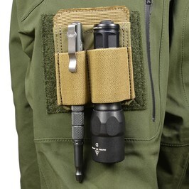 5.11タクティカルのペン、ライトのホルダーパッチ。ホルダーの背面はベルクロのオスが付けられているため、ベルクロのメスが付いたジャケットやバッグ、ポーチ等に取り付けることができます。