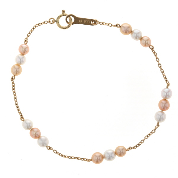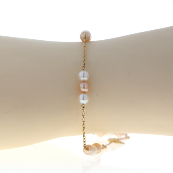 | 商品紹介 | TASAKIらしい上品な存在感を放つ、K18イエローゴールド製ブレスレットです。 4.3mmサイズのパールを、ピンクとホワイトで交互に配した3粒セットを、5か所にステーション状にあしらっています。 真珠が連なるデザインは、可憐さと華やかさを併せ持ち、手元を軽やかに彩ります。 |
