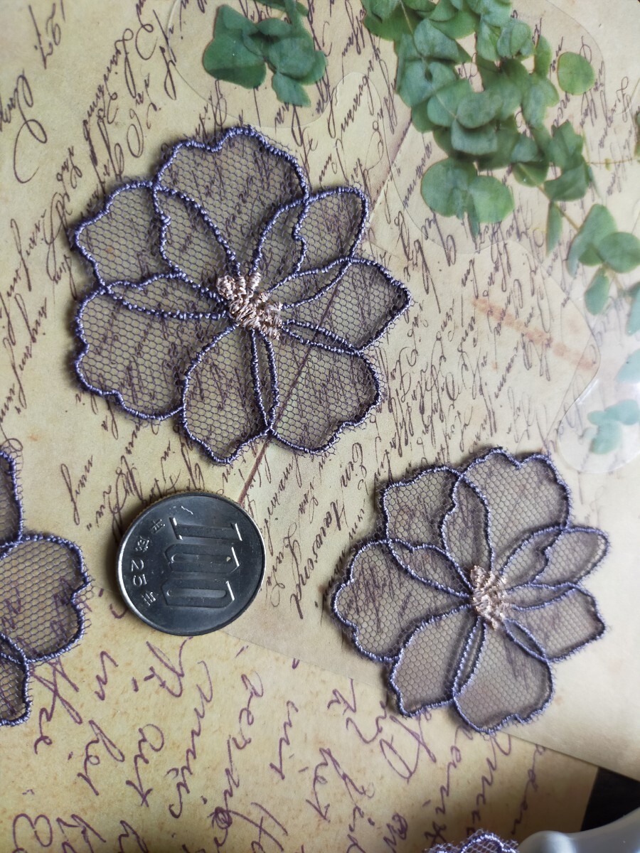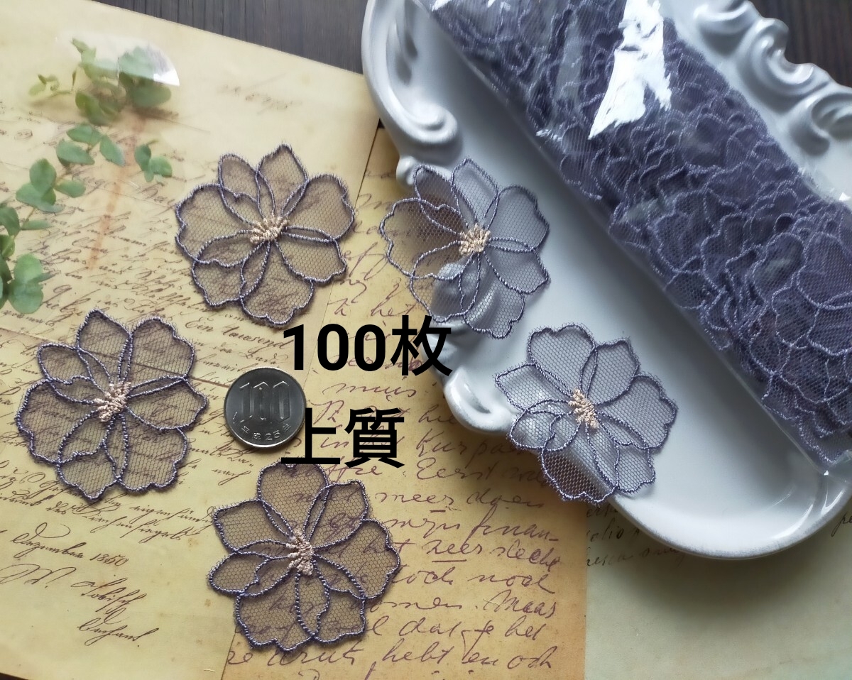 A426last【100枚】まとめ、【4.7−5cm】チュールレースモチーフ鳩色グレー花フラワーキラキラ蕾デコパーツハンドメイド副資材
