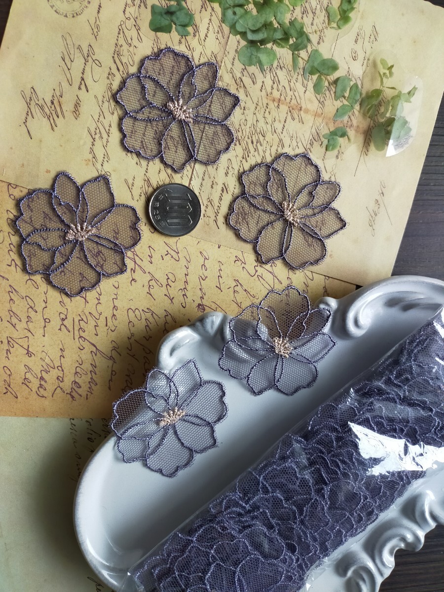 素材感:柔らかい/ポリエステル/上質、蕾部分にキラキララメ糸使用/鳩グレーに少し紫がかったお色