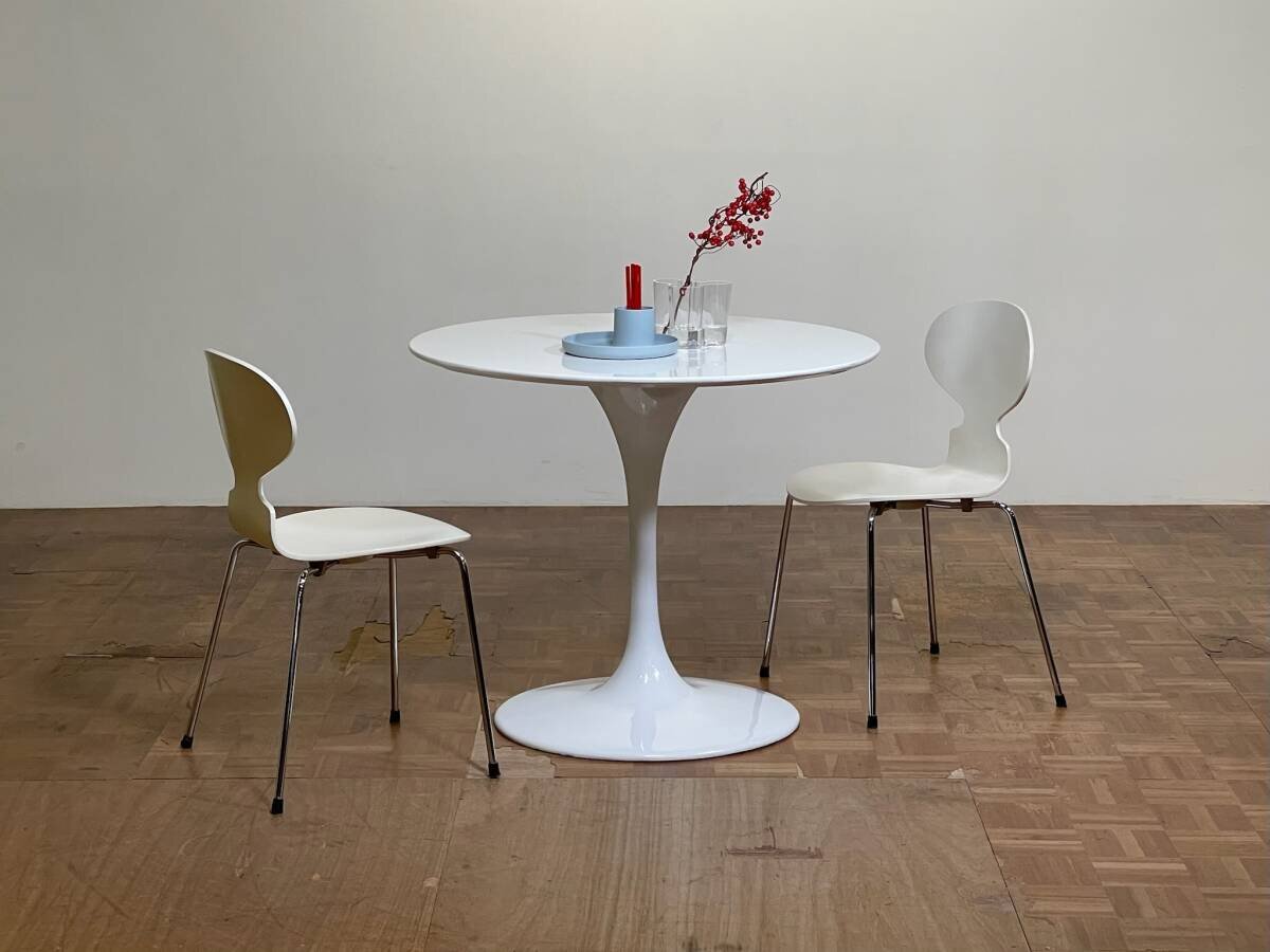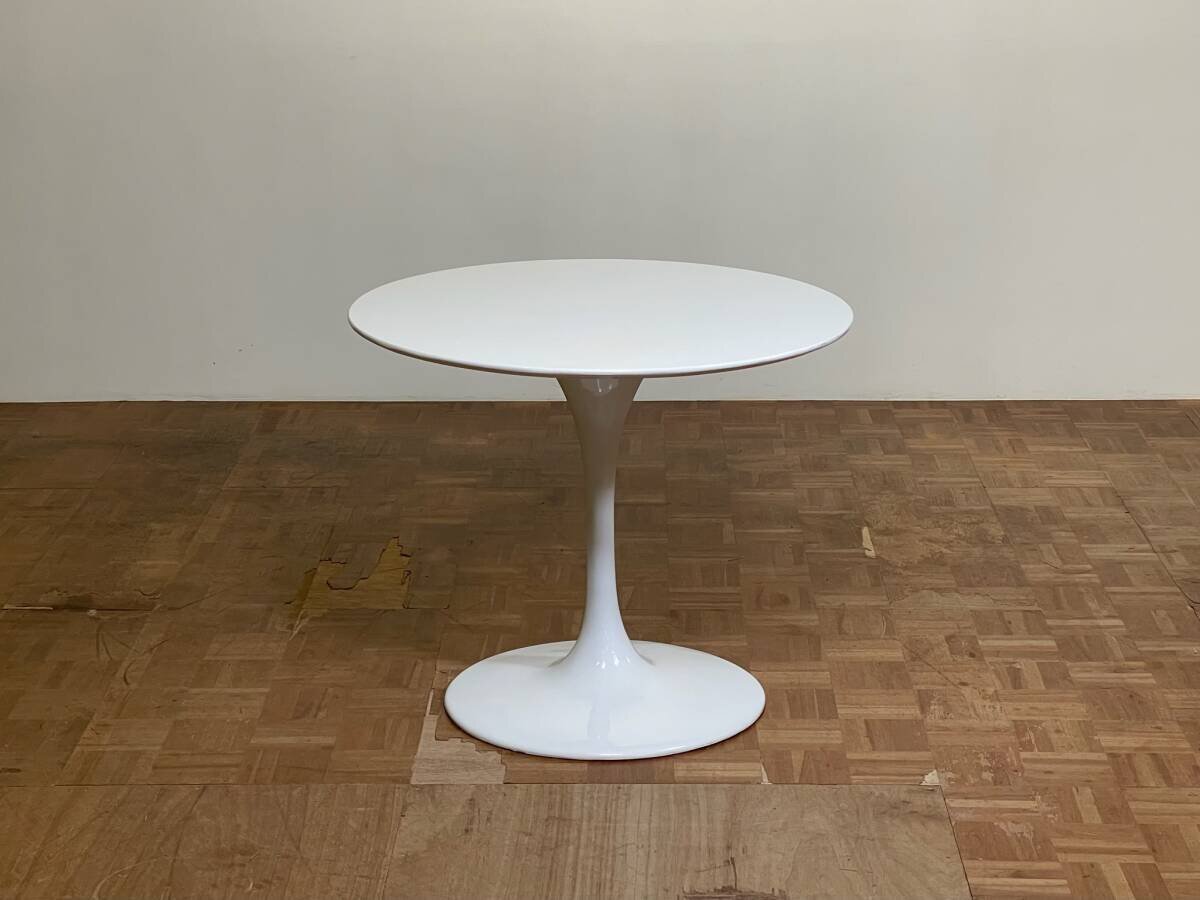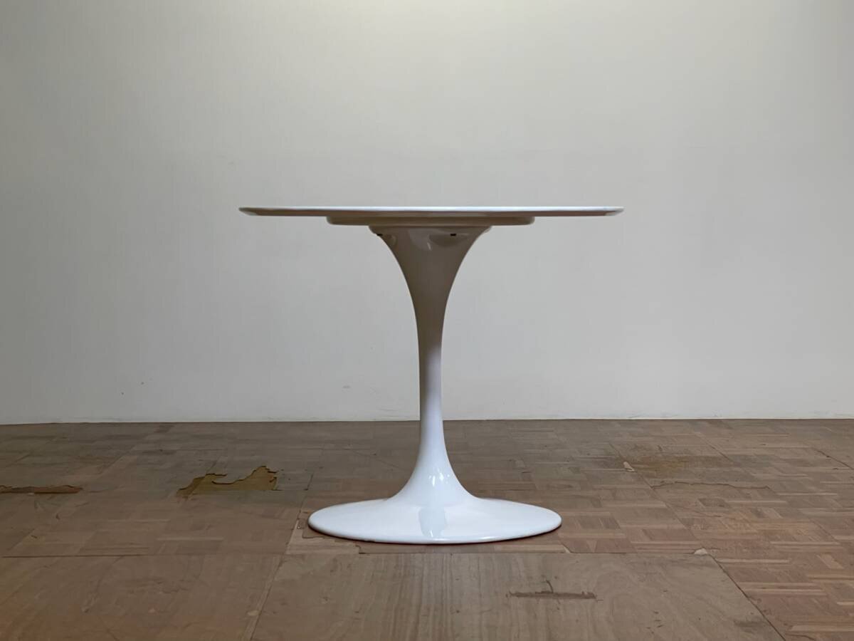 支柱とベースを繋ぐ、地中から萌え出るようなすっきりと艶やかなベースデザインで、プロダクトデザイン史に燦々と輝くリーディングケースとして知られる、通称 "チューリップテーブル"。リプロダクト品。