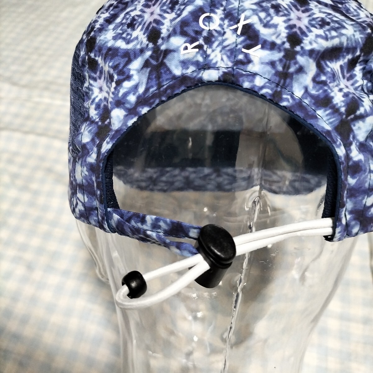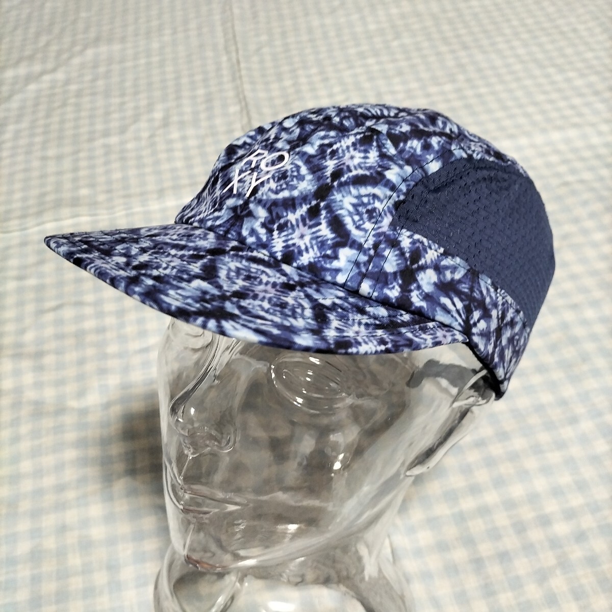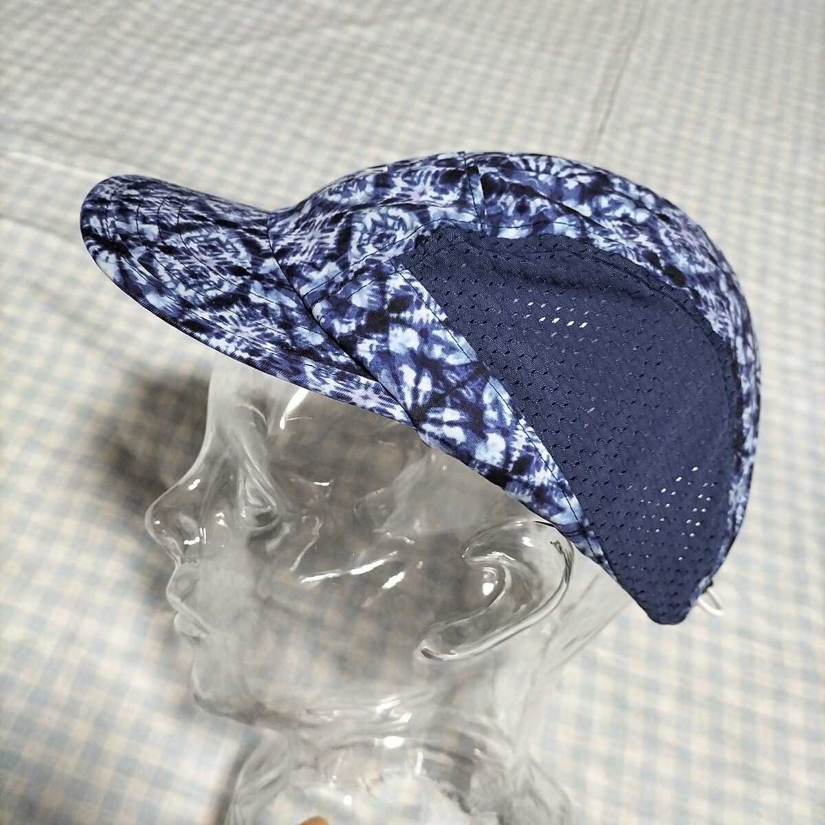色は青紫系の濃淡タイダイっぽい柄 メッシュ部分は紺の無色 サイズはフリー 後ろのゴムで調節できます。レディース、キッズ向き つばの長さ5.5cm