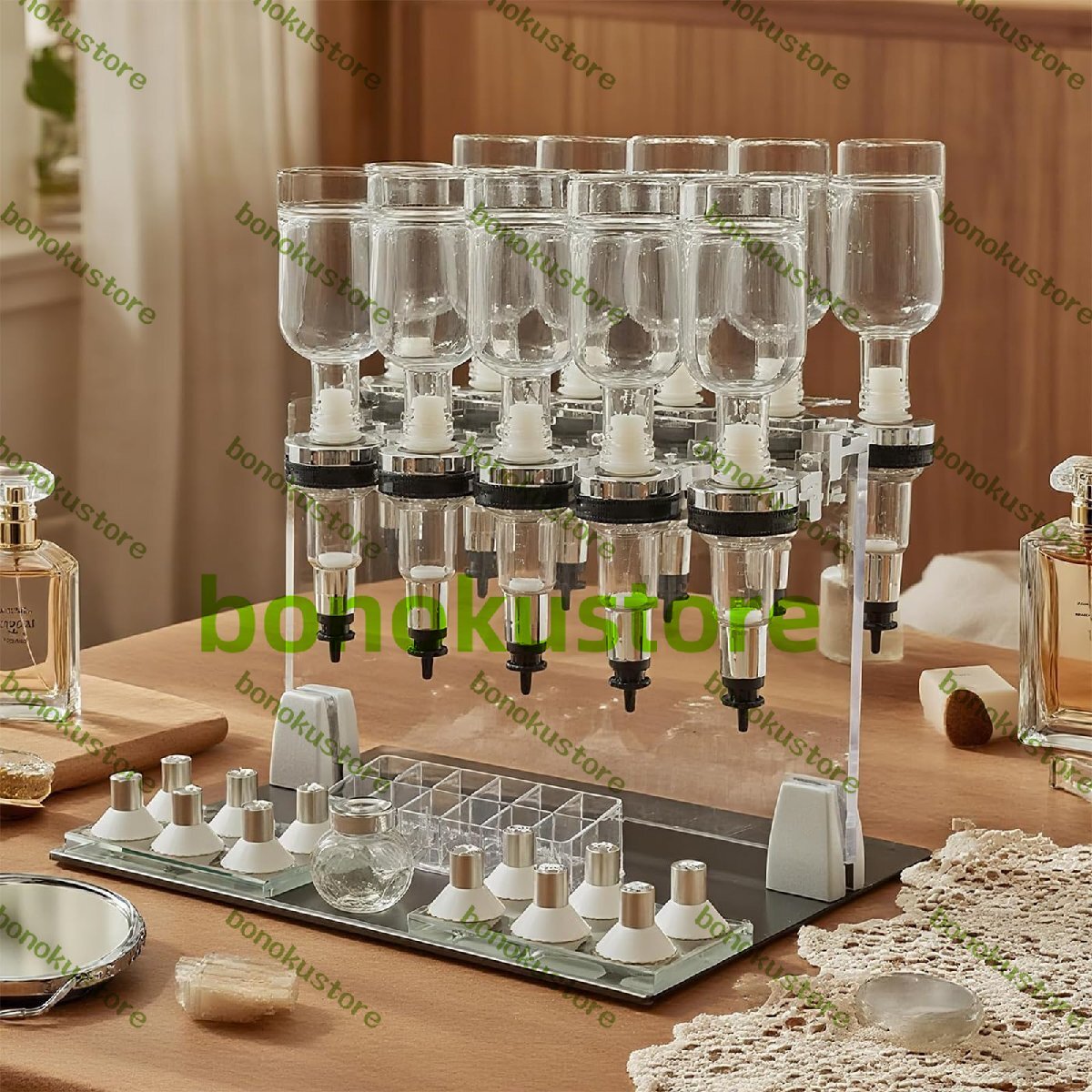 手動香水詰め替えポンプステーション コスメ液体分配器 12本用香水ディスペンサーツール テストカップ付き 液体ディスペンサー ・コスメ・精油・調味料用 定量分配収納ツール バー・スタジオ・サロン・店舗用・研究室 DIY 用