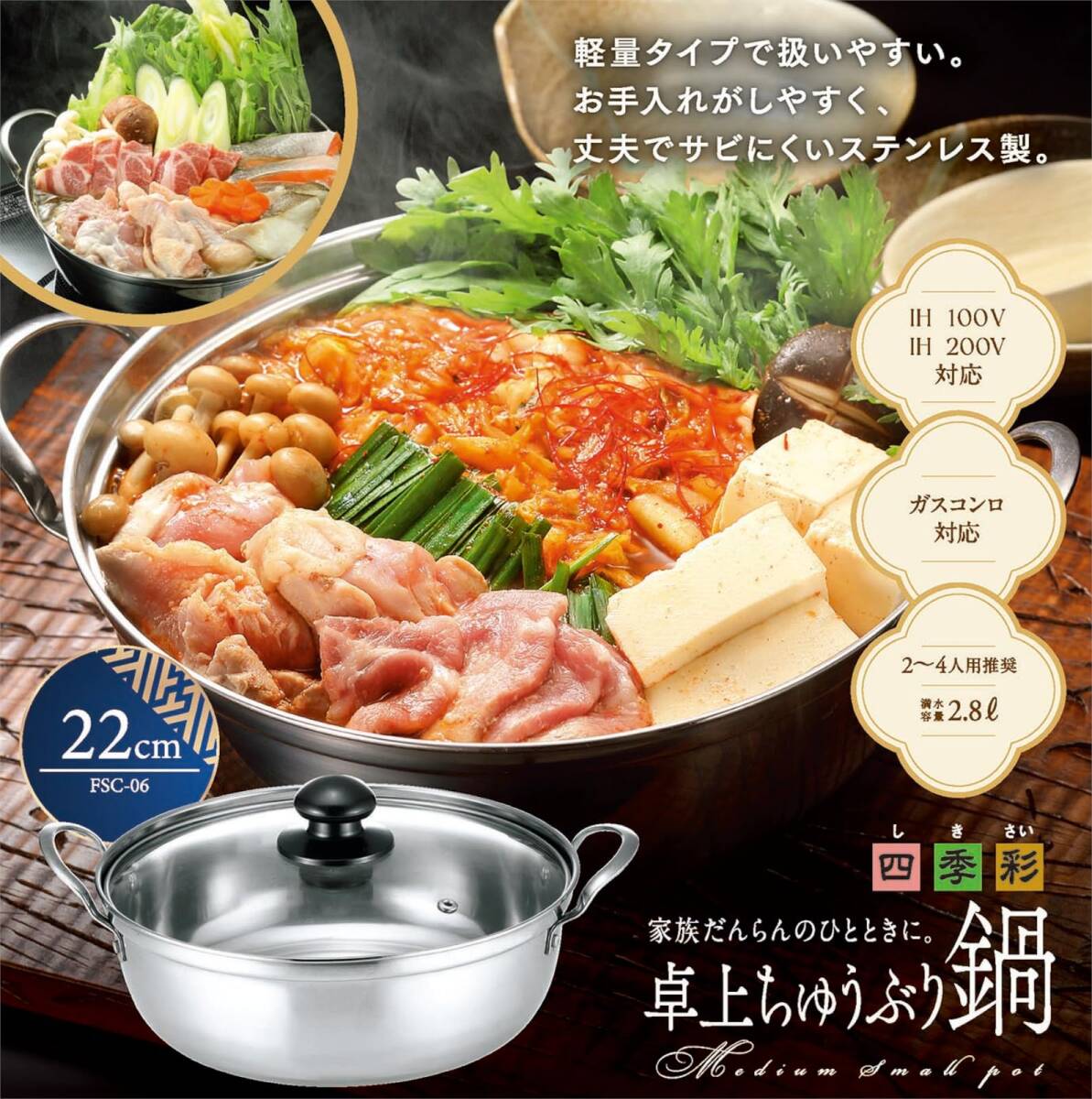 カクセー(Kakusee) 卓上鍋 22cm 2~4人用 両手鍋 ガスコンロ HI対応 軽量 ガラス蓋 ステンレス製 サビにくい 四季彩 しきさ