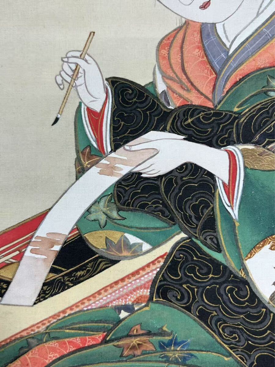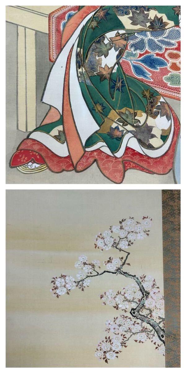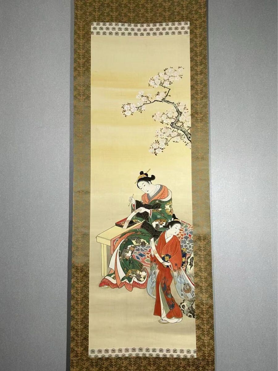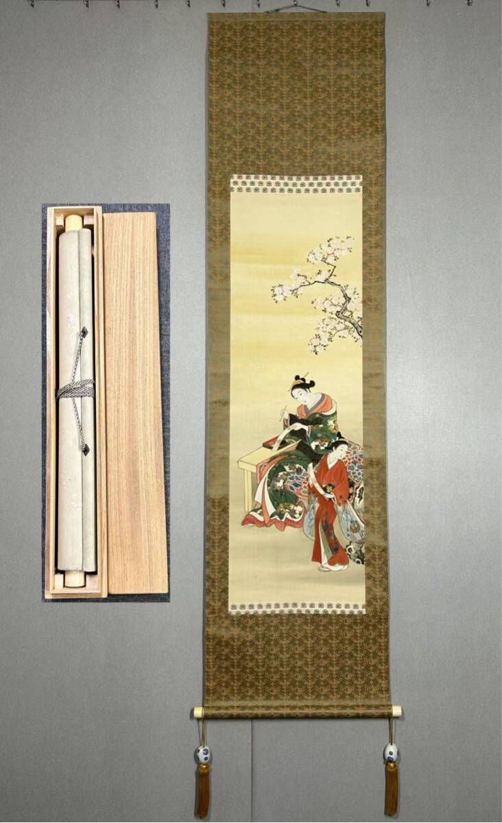 【模写】H-796掛軸 絹本 桐箱 日本画 美人画 浮世絵 無落款 桜美人 細密絵