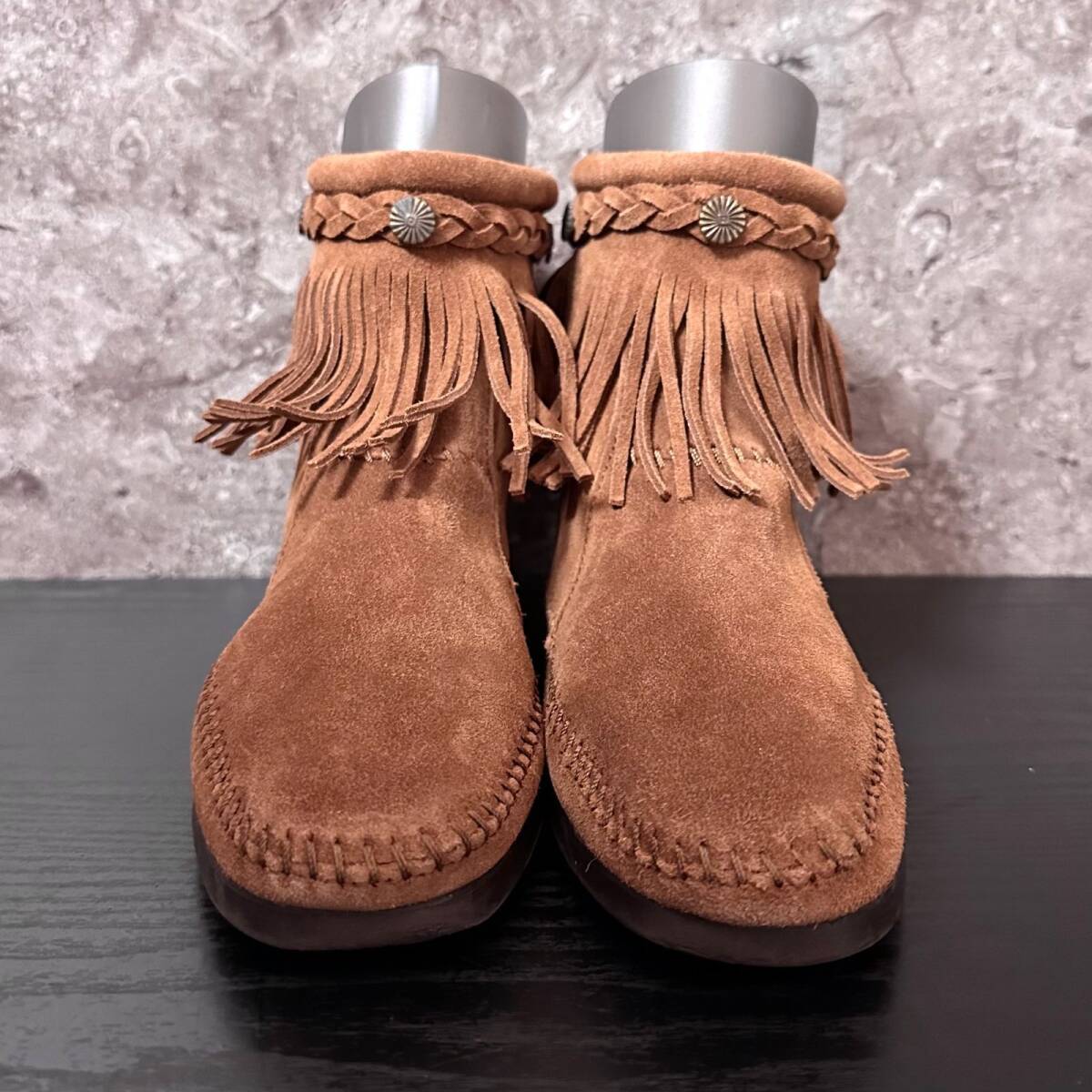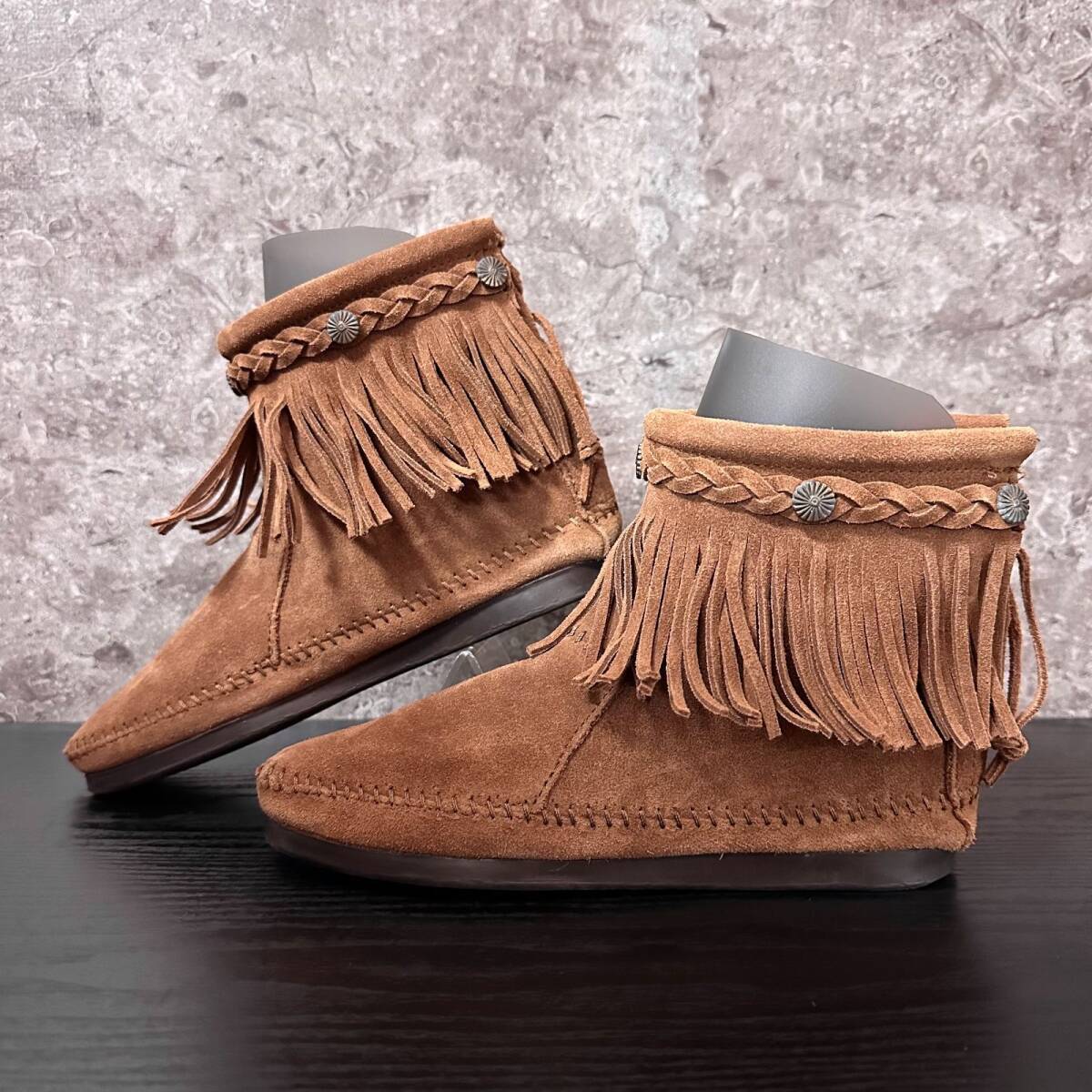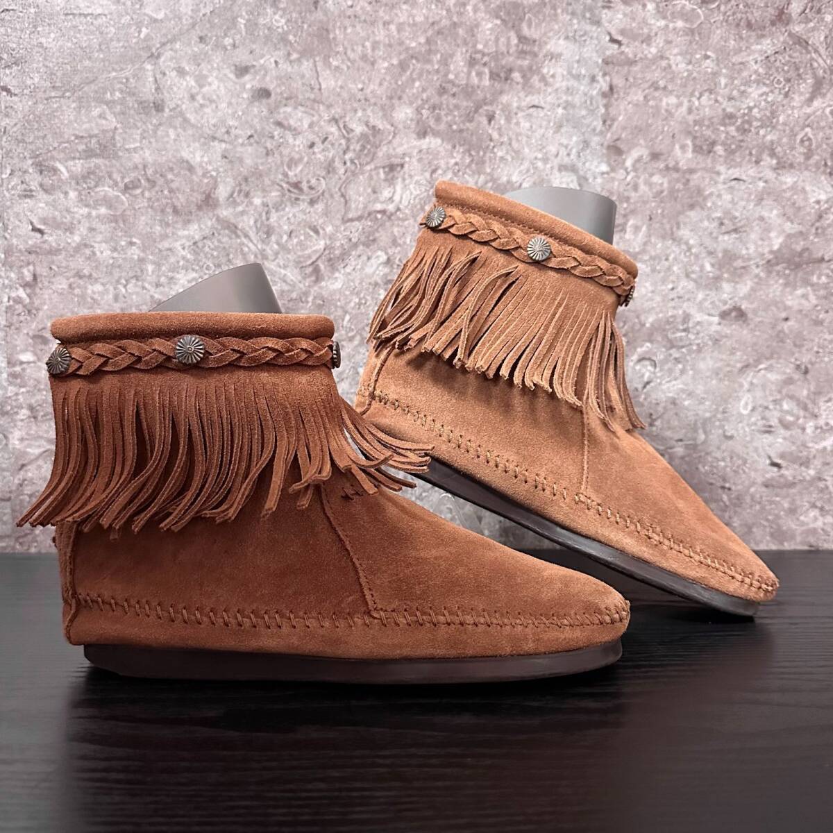 ・細くてやわらかいフリンジは動くたびにふわっと揺れるのが可愛く、後ろのジッパーで脱ぎ履きも楽ちんなのがうれしいブーツです。