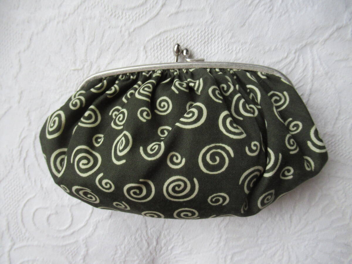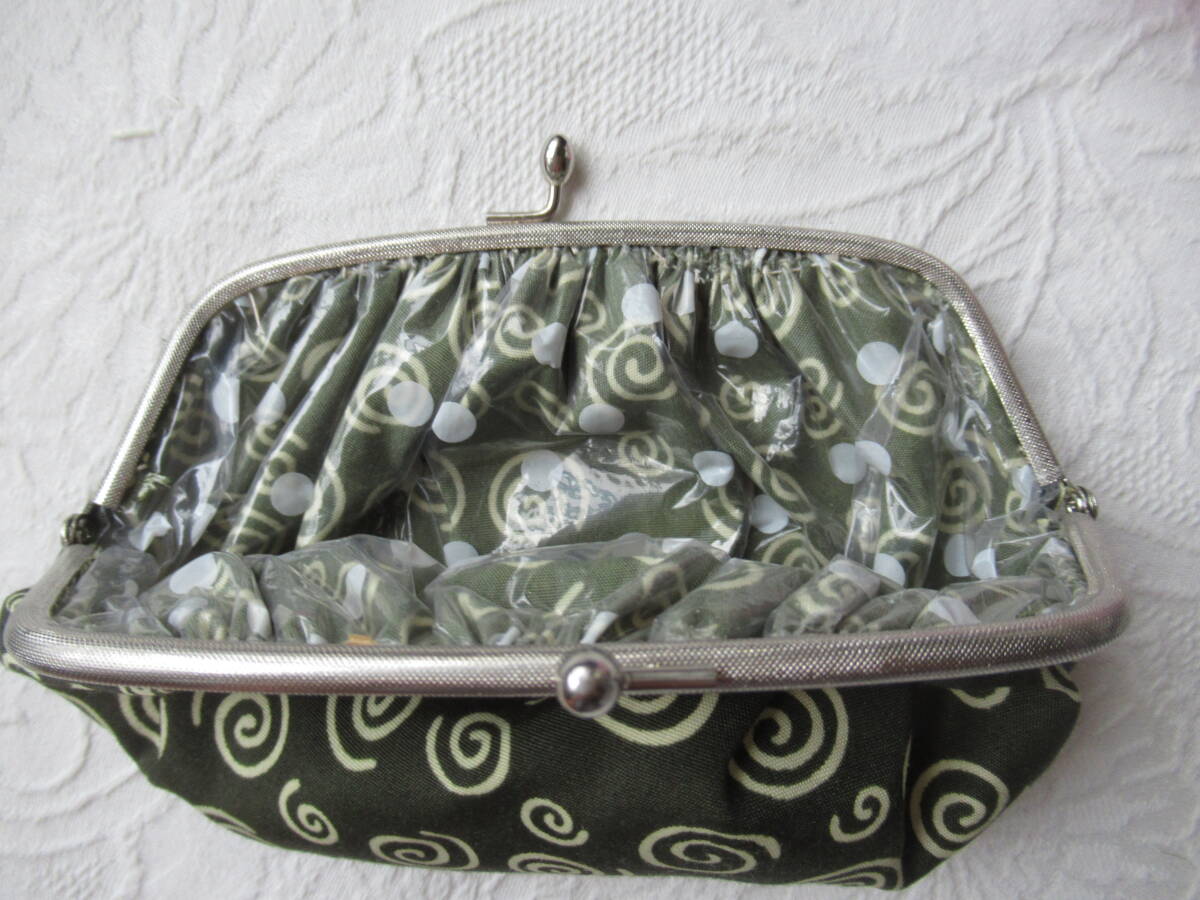 手作り ぬれタオル入れ お手拭き入れ 内側ビニール 口金式 16×11cm 深緑地渦巻柄