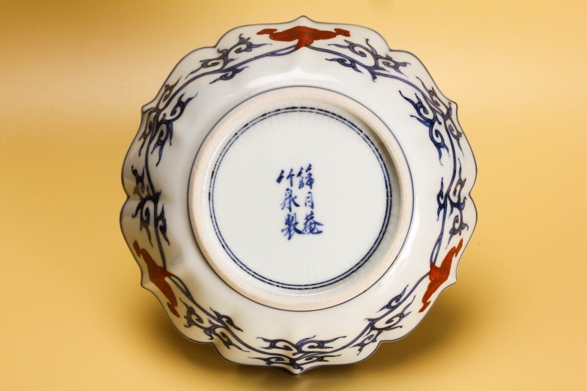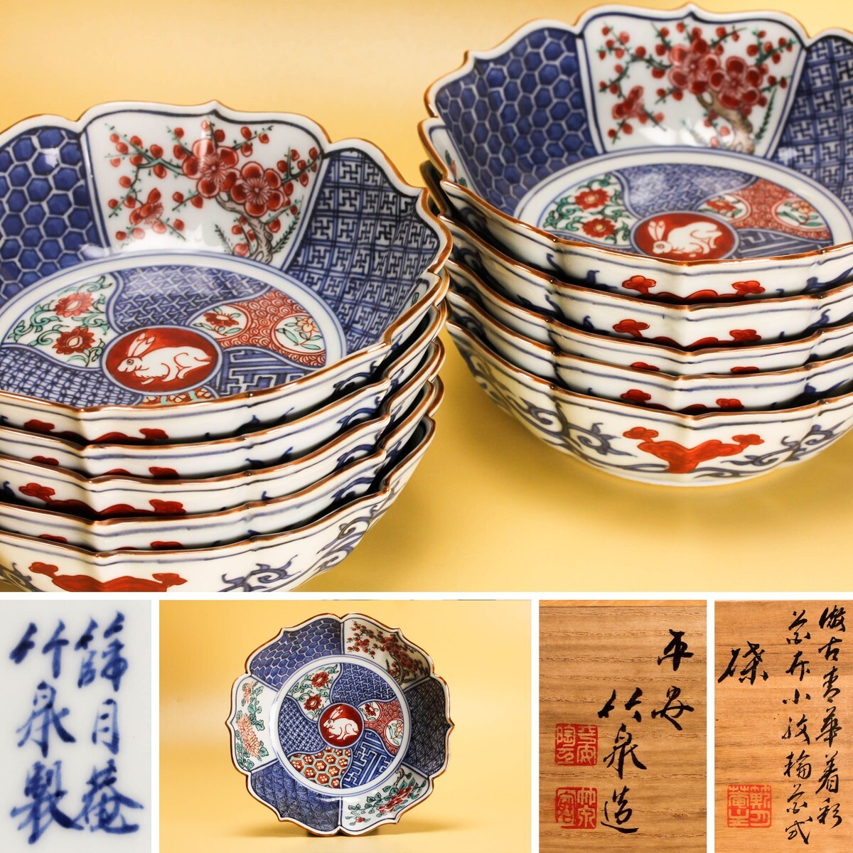 二世 三浦竹泉 倣古青華着彩花兎小紋輪花式皿 十客 共箱 共布 本物保証