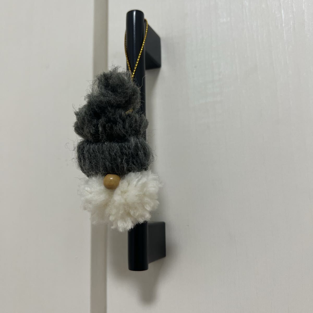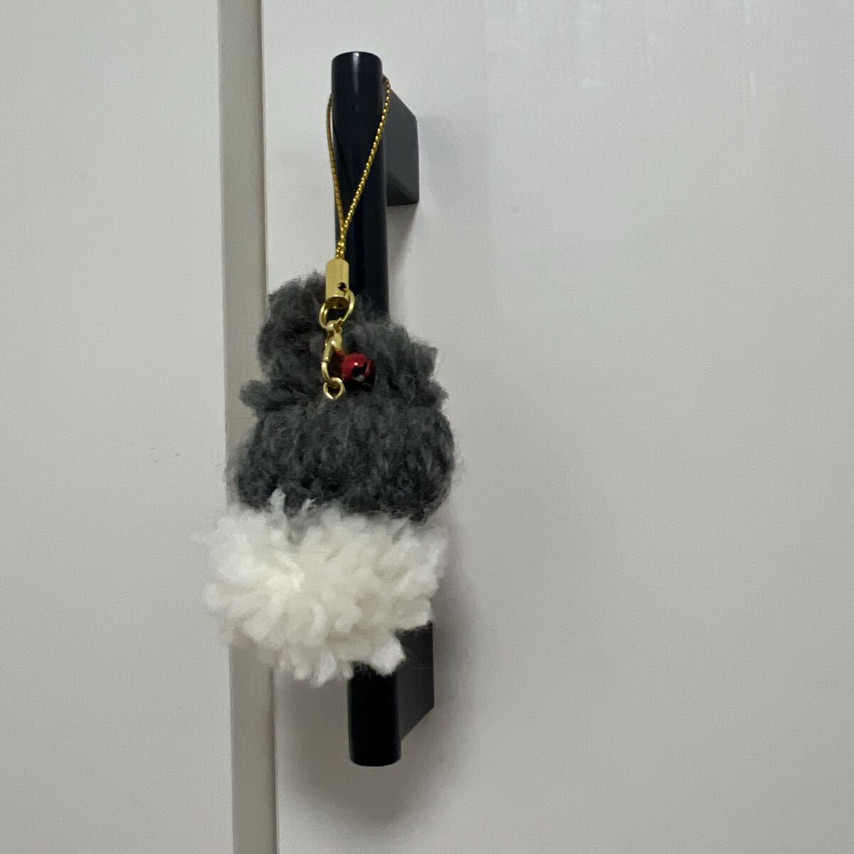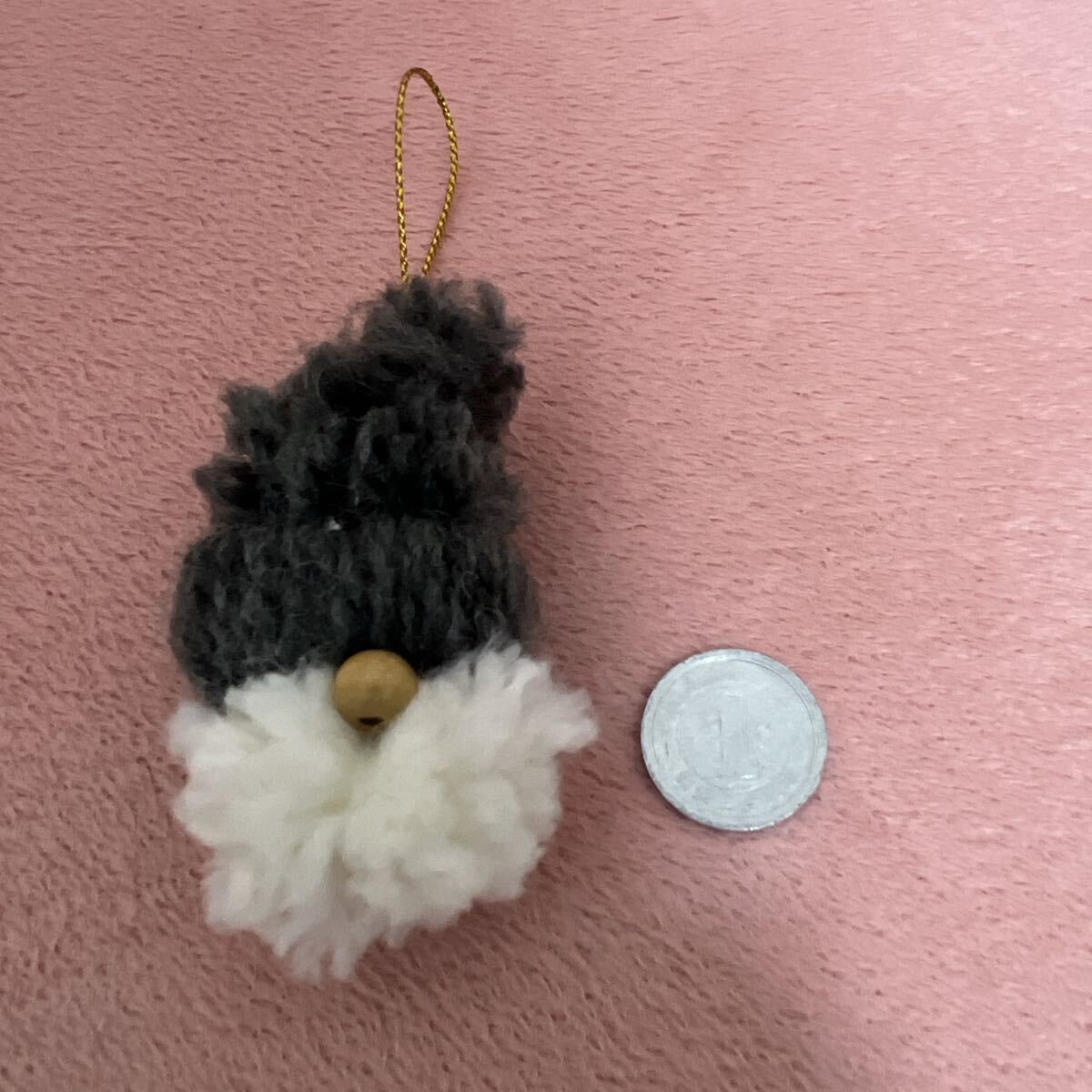 グレーとホワイトのポンポンで作られた帽子をかぶったサンタクロースのストラップ付きアクセサリー。 素材 毛糸