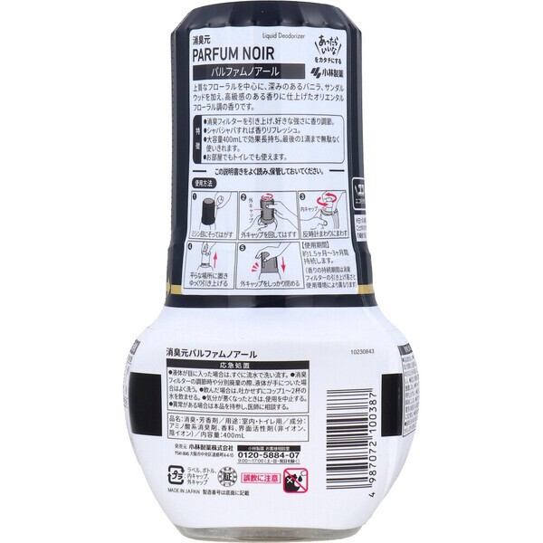お部屋にもトイレにも両方使える。 消臭フィルターを引き上げ、好きな強さに香り調節。 ・シャバシャバすれば香りリフレッシュ。 ・大容量400mLで効果長持ち。 最後の1滴まで無駄なく使いきれます。 ・お部屋でもトイレでも使えます。 ・パルファムノアール:上質なフローラルを中心に、深みのあるバニラ、サンダルウッドを加え、高級感のある香りに仕上げたオリエンタルフローラル調の香りです。 個装サイズ:95X173X80mm 個装重量:約485g 内容量:400mL 製造国:日本 【発売元:小林製薬株式会社】 【品名】 消臭・芳香剤 【用途】 室内・トイレ用 【成分】 両性界面活性剤系消臭剤、香料、界面活性剤(非イオン、陰イオン) 【使用方法】 (1)ミシン目にそってはがす。 (2)外キャップを回してはずす。 (3)反時計まわりにまわす。 (4)平らな場所に置きゆっくり引き上げる。 (5)外キャップをしっかり閉める。 【使用期間】 約1.5ヶ月~3ヶ月間持続します。 (香りの持続期間は消臭フィルターの引き上げ高さと使用環境により異なります。) 【使用上の注意】 ・本品は飲めない。 ・小児、認知症の方などの誤飲に注意する。 ・小児、認知症の方などの手の届くところには置かない。 ・安定した場所に置き、倒れたまま放置しない。 ・外キャップだけで本品を持ち上げない。 ・液がこぼれるので横・斜めにしない。 ・液がつくとシミや変色、変形の原因となる場合があるので、すぐに拭き取る。 ・用途以外に使用しない。 ・直射日光のあたる所、高温の場所に置かない。 変色・変質することがある。 ・誤飲に注意。 【応急処置】 ・液体が目に入った場合は、すぐに流水で洗い流す。 ・消臭フィルターの調節時や分別廃棄の際、液体が手についた場合はよく洗う。 ・飲んだ場合は、吐かせずにコップ1~2杯の水を飲ませる。 ・気分が悪くなったときは、使用を中止する。 ・異常がある場合は本品を持参し、医師に相談する。 注意事項 ※予告なく成分・パッケージが変更になることがございます。 予めご了承ください。 *予告なく成分・パッケージが変更になることがございます。予めご了承ください *ダンボールを使用して発送する場合には、入数以下の個数の場合、 中古ダンボールを使用する場合があり、ご注文の商品とは異なるダンボールになる場合があります。 あらかじめ、ご了承ください。 |