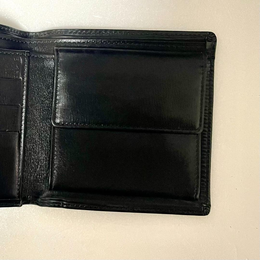 ブラックのレザー製二つ折り財布、カードポケット3つとコインポケット付き。