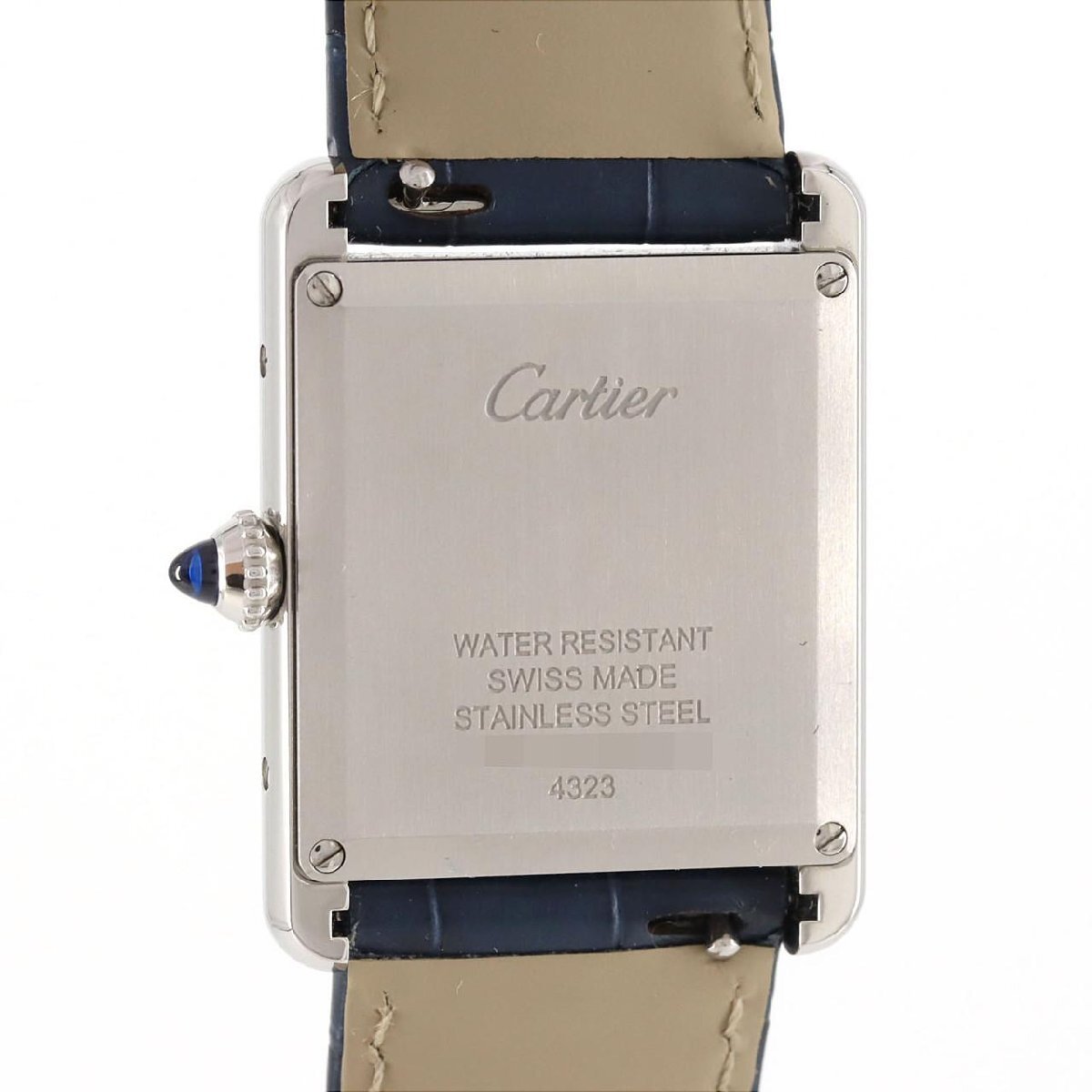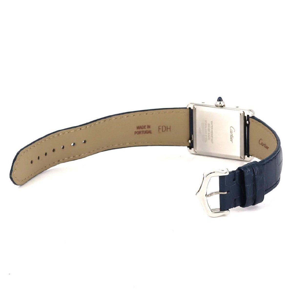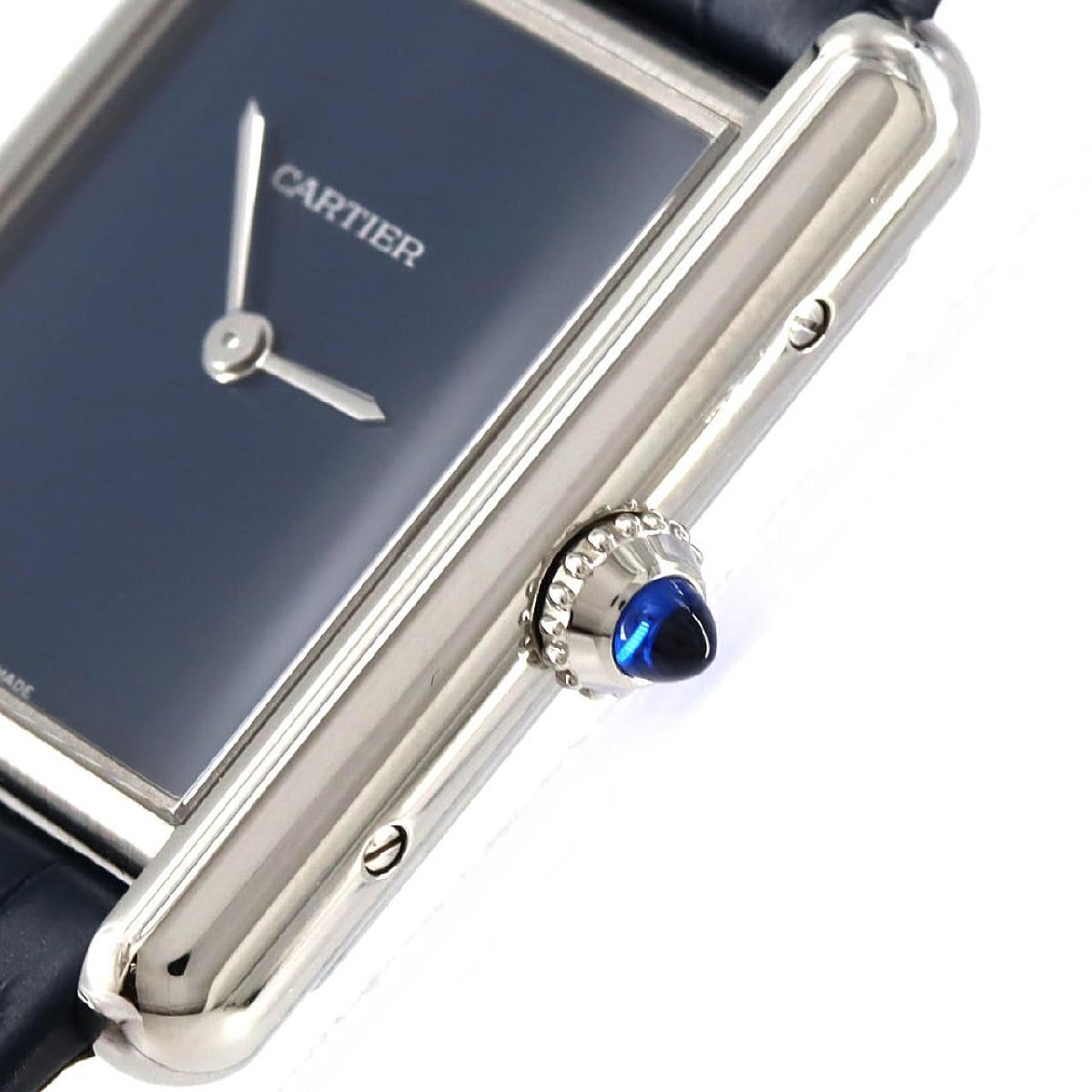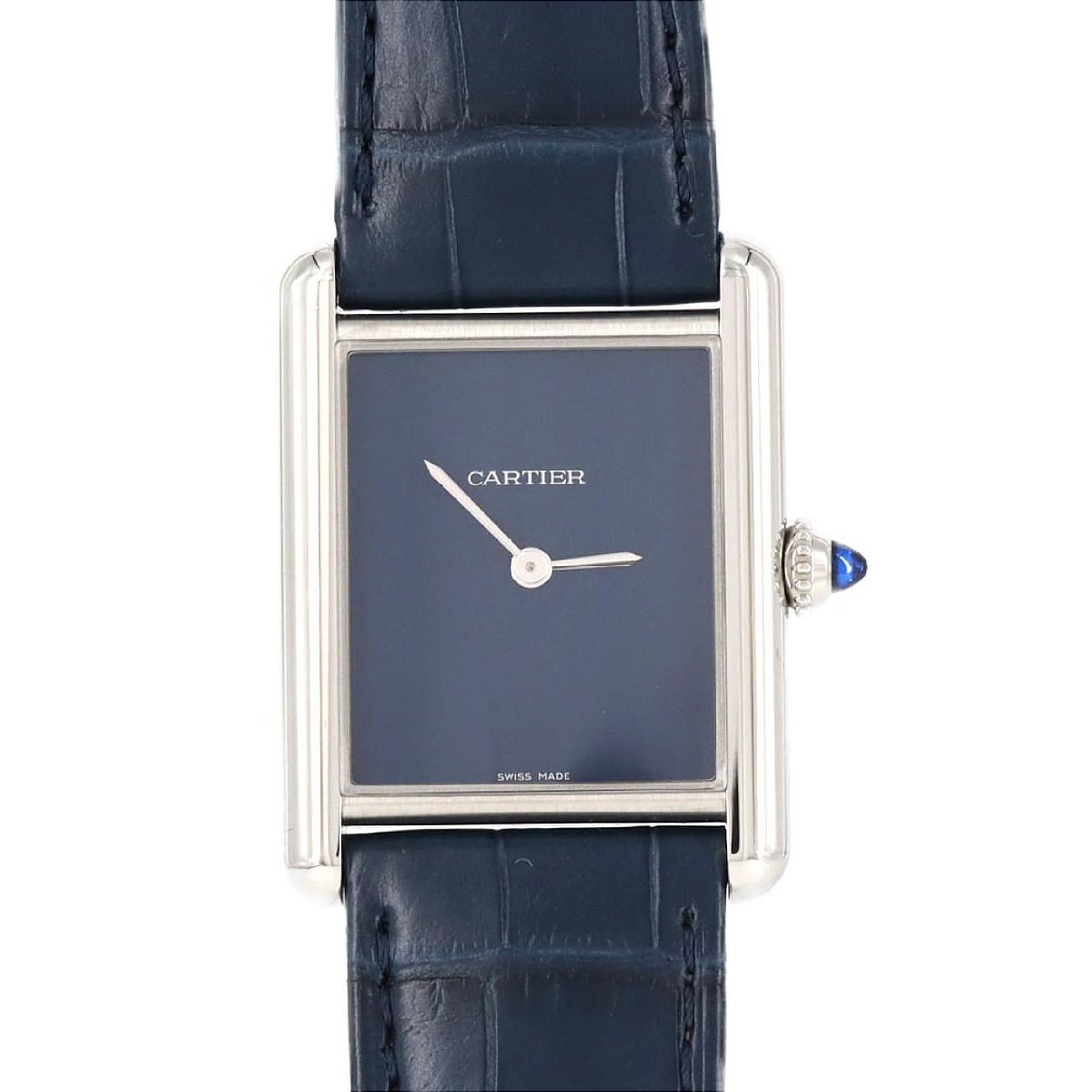 2021年に登場した、カルティエ「タンクマスト」のLMサイズモデルです。この一本(WSTA0055)は、メゾンの伝統であるローマ数字インデックスやレールウェイ(分目盛り)をあえて排し、文字盤を鮮やかなブルーで統一したミニマルなデザインが最大の特徴です。ムーブメントには、約8年の長寿命を実現した高効率クォーツを搭載。ケースサイズ25.5mmのステンレススチール製ケースに、アイコニックなブルーのカボションリューズが映えます。クラシックなタンクの意匠に、現代的な遊び心を加えたスタイリッシュなタイムピースです。